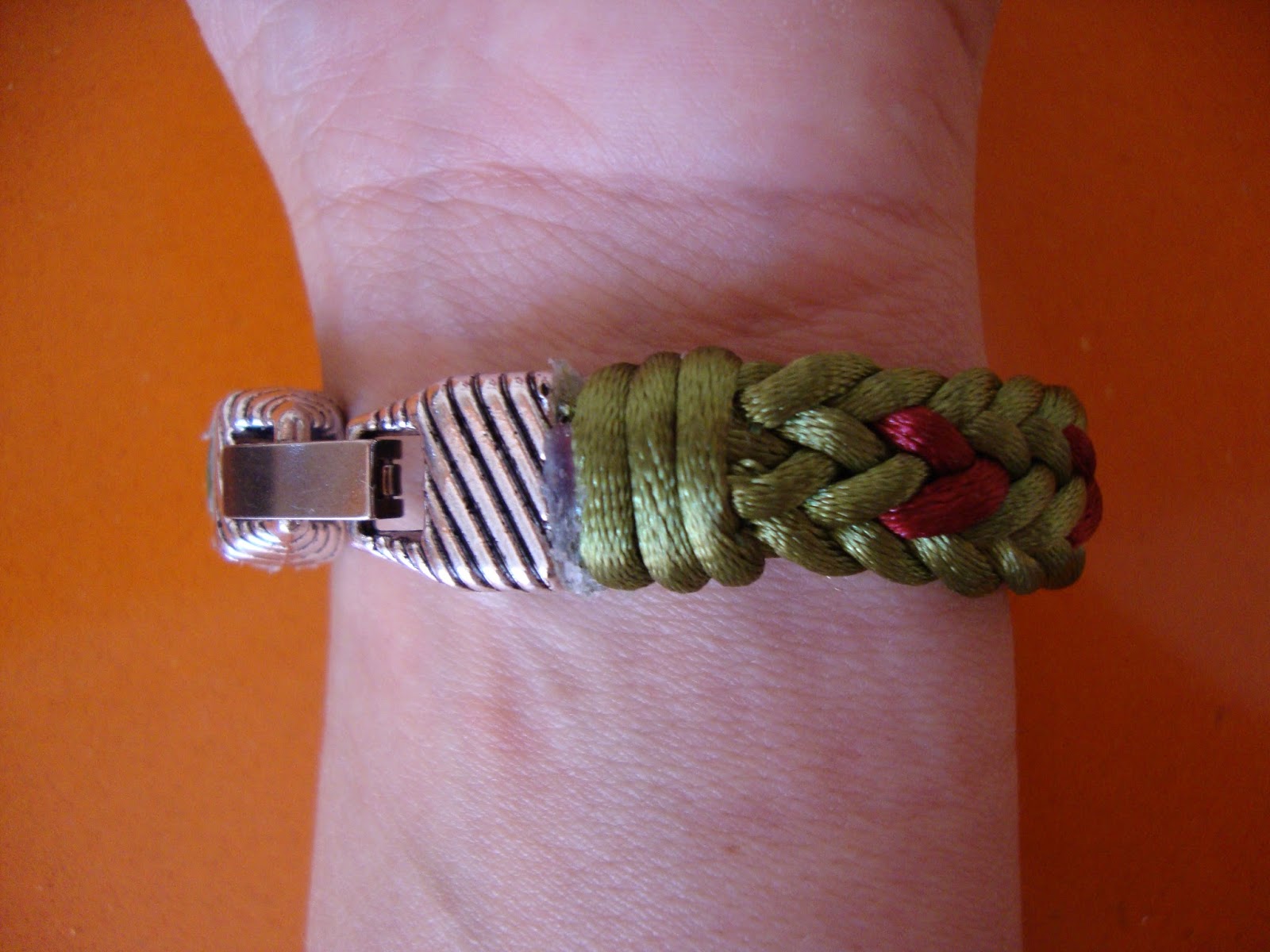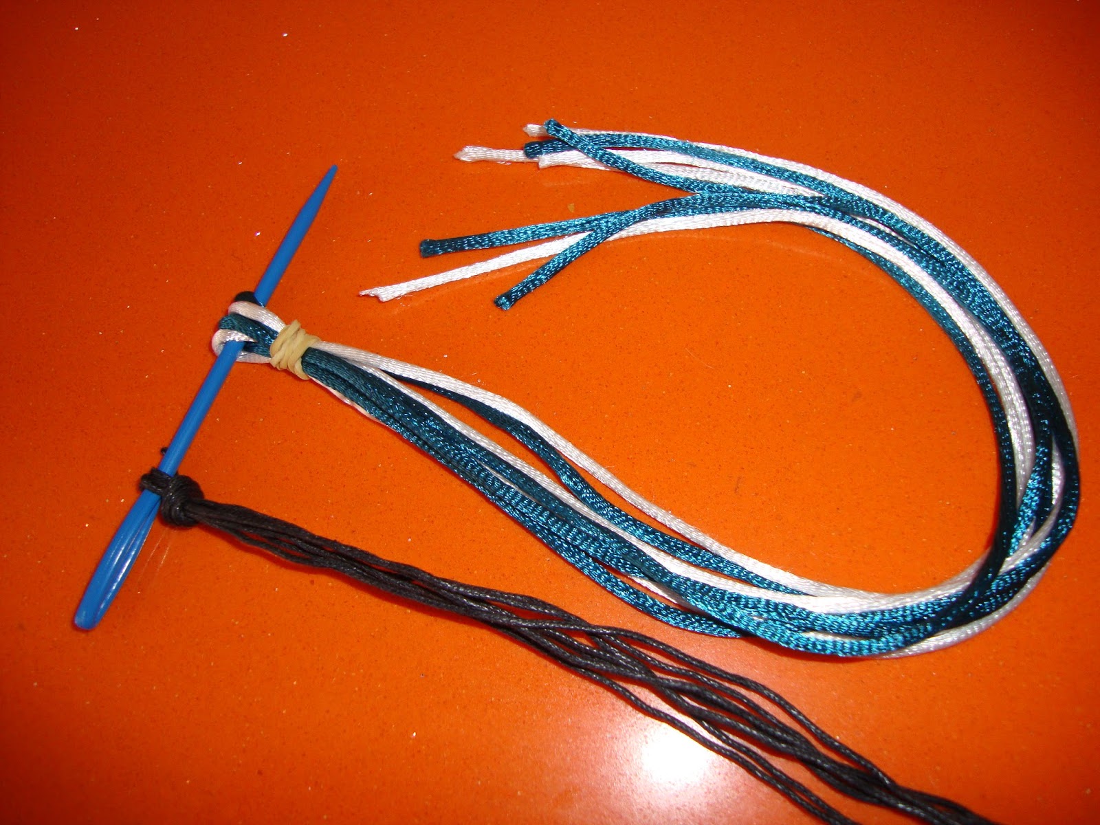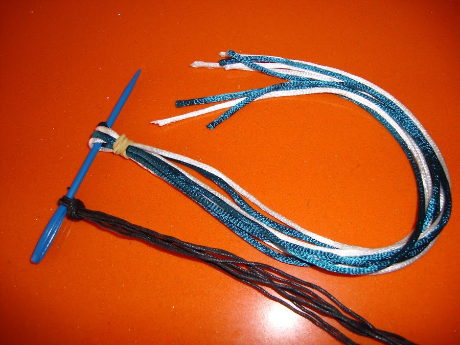 Con los hilos juntos podemos hacer un nudo en el extremo (si estamos trabajando con hilos o cordones finos) o bien un atillo ayudándonos de una gomita o de un hilo auxiliar que ataremos fuerte alrededor (para evitar hacer con los cordones y nudo grueso que nos consumiría mucho cordón y quizás después no lo vamos a aprovechar). Cuando hacemos esto tenemos que ir pensando cómo vamos a rematar la pulsera, por si nos interesa dejar un bucle pequeño (solo para dejar pasar al final la mitad de los hilos del otro extremo o para rematar y poner un broche metálico) o grande para cortar los hilos por medio y dejarlos largos y junto con los del otro extremo hacer un nudo o emplear un nudo accesorio (como expliqué en otra entrada).