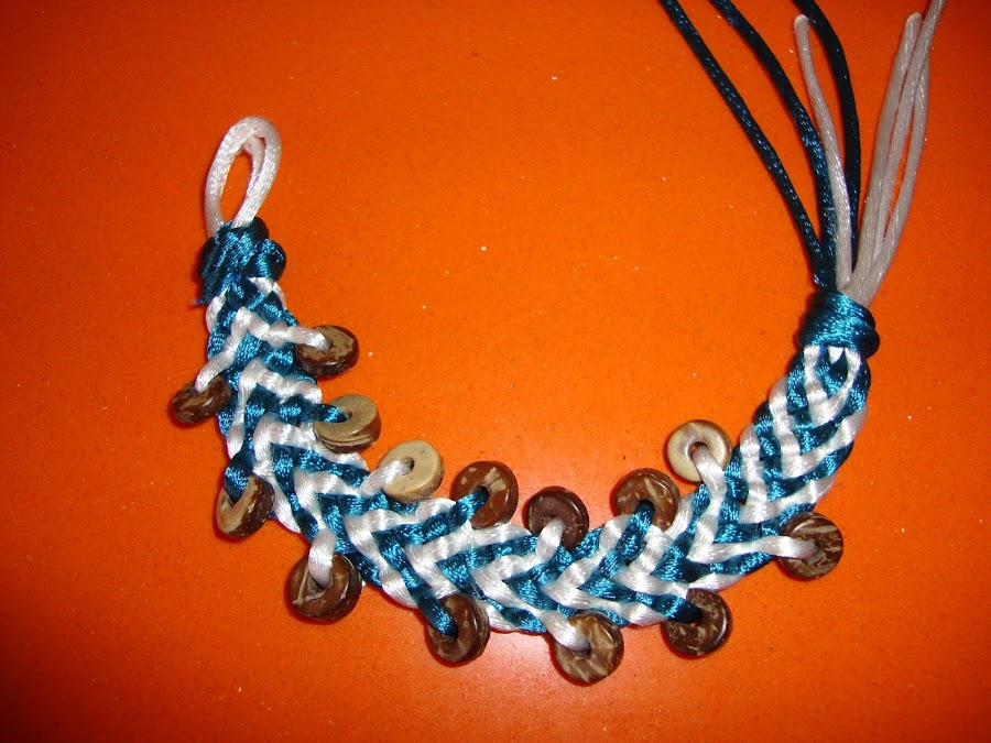 Aprovecho para enseñaros esta variante que he terminado. Es uno de los trenzados que ya mostré en la entrada "MUESTRAS PLANAS SENCILLAS". Pero esta vez añadí unos abalorios tipo ruedillas de madera. Cómo quería que me quedaran por fuera los fui incluyendo en los pasos E a 14 y e a 17. Pero no en todos, como veis, para que quedasen espaciadas lo hacía en uno sí, dos no, uno sí, dos no.