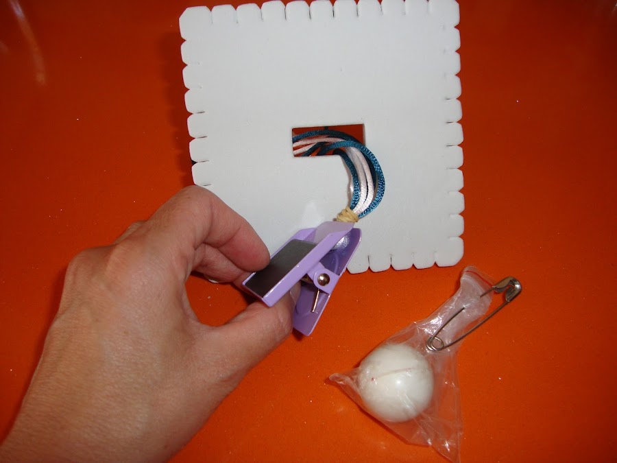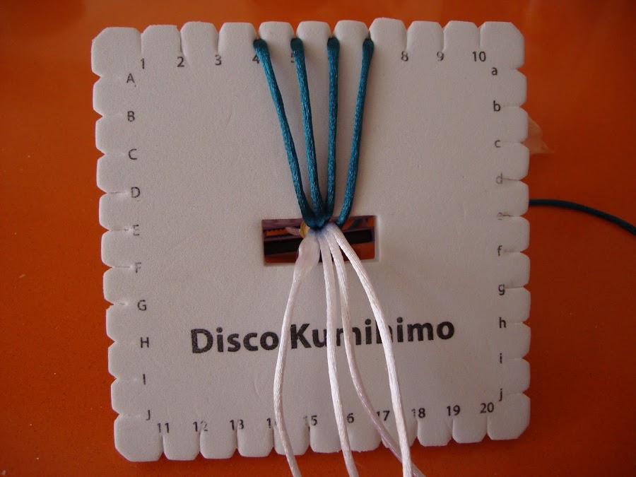 Ese nudo o atillo es el que se introduce por el agujero del disco kumihimo. Después conviene emplear algo que nos sirva de peso ya que nos ayuda a mantener una tensión en el tejido que facilita la uniformidad en el trenzado.