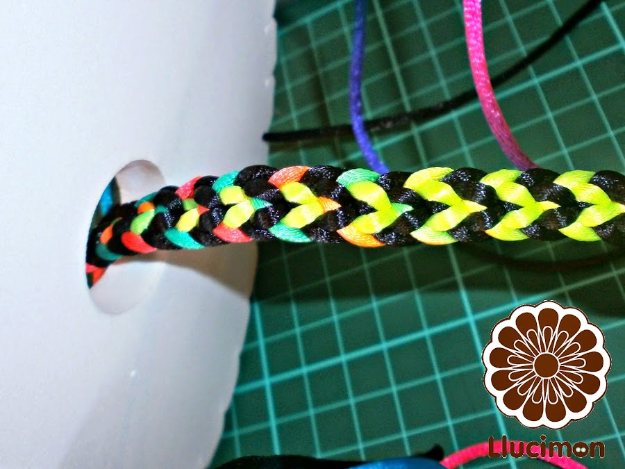 Seguimos enseñando diferentes patrones para trabajar con el kumihimo. En esta ocasión vemos cómo hacer un trenzado plano sencillo utilizando el disco redondo que se utiliza habitualmente para hacer los cordones redondos, sin necesidad de disponer de disco cuadrado.