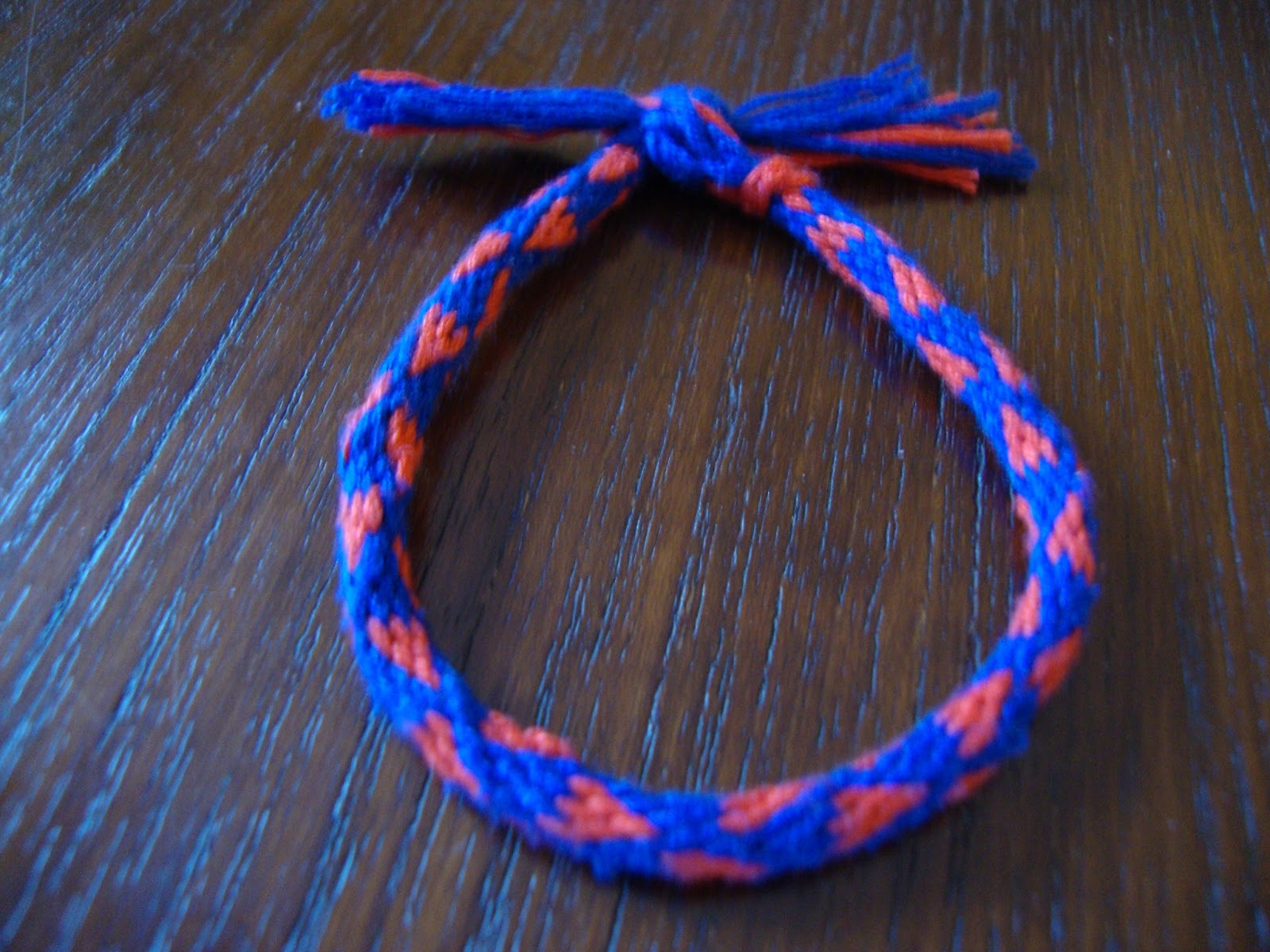 Escogemos dos colores que contrasten, en este caso rojo y azul. 6 de rojo y 10 de azul de unos 30-40 cm (o sea, 3 y 5 de doble tamaño, que se doblan y anudan en el extremo que irá en el centro del disco, de forma que nos quedan 6 y 10 hebras para repartir por el disco). Secuencia:
