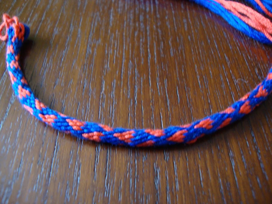 Por eso sólo tengo que añadir la secuencia de colocación de las hebras de color para comenzar a trenzar y que se nos vayan formando los triángulos como veis en la foto.
