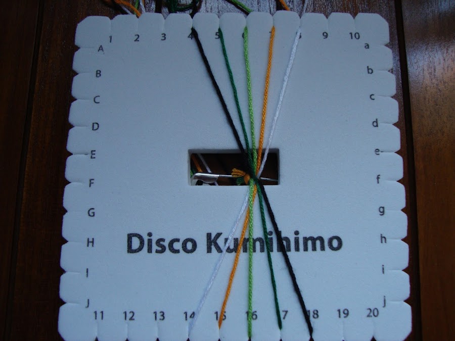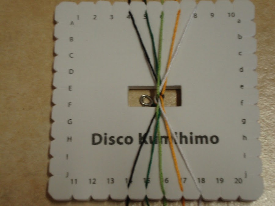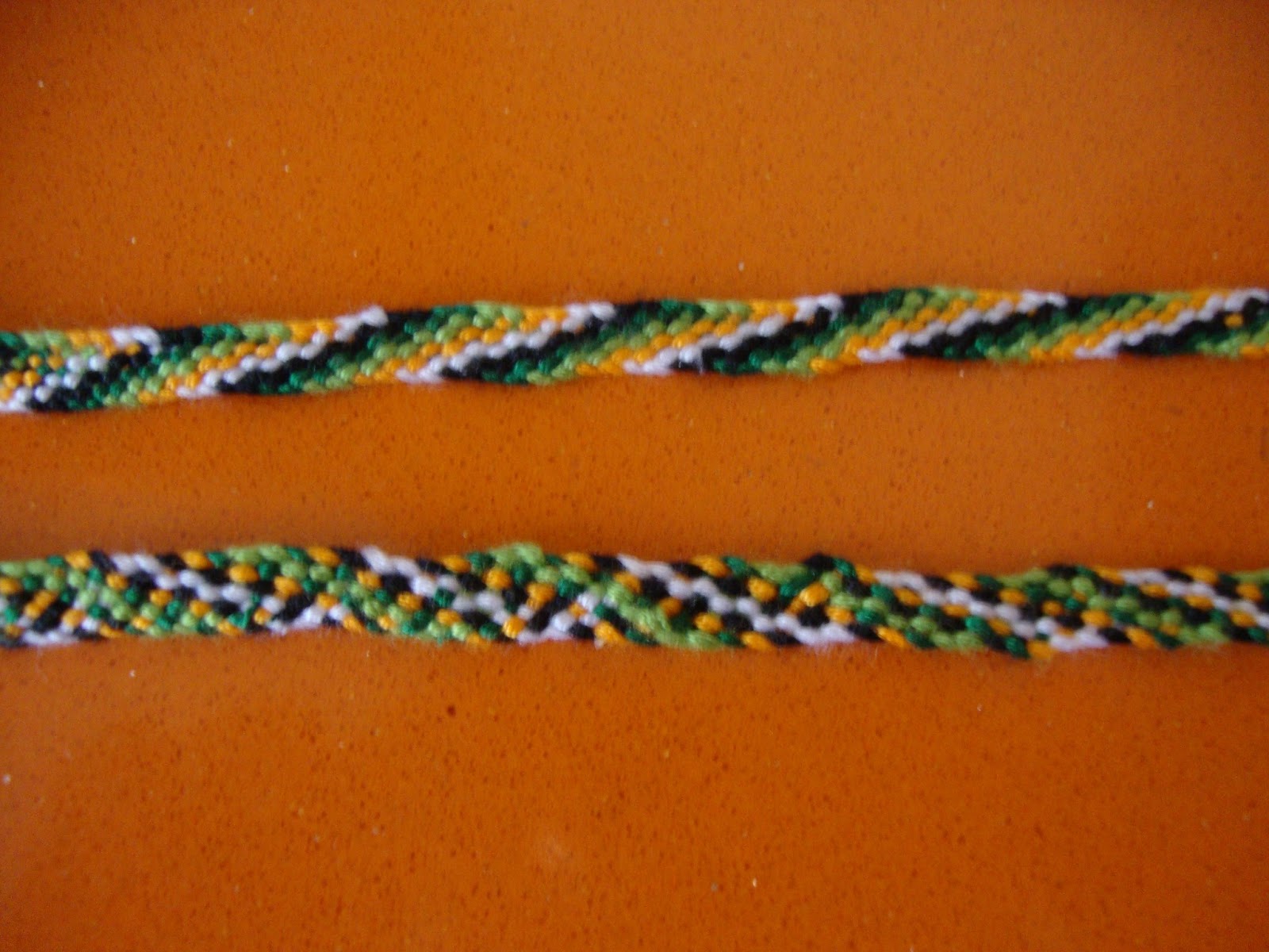 La primera pulsera con las rayas bien definidas se corresponde con esta disposición de colores simétrica arriba y abajo del kumihimo.