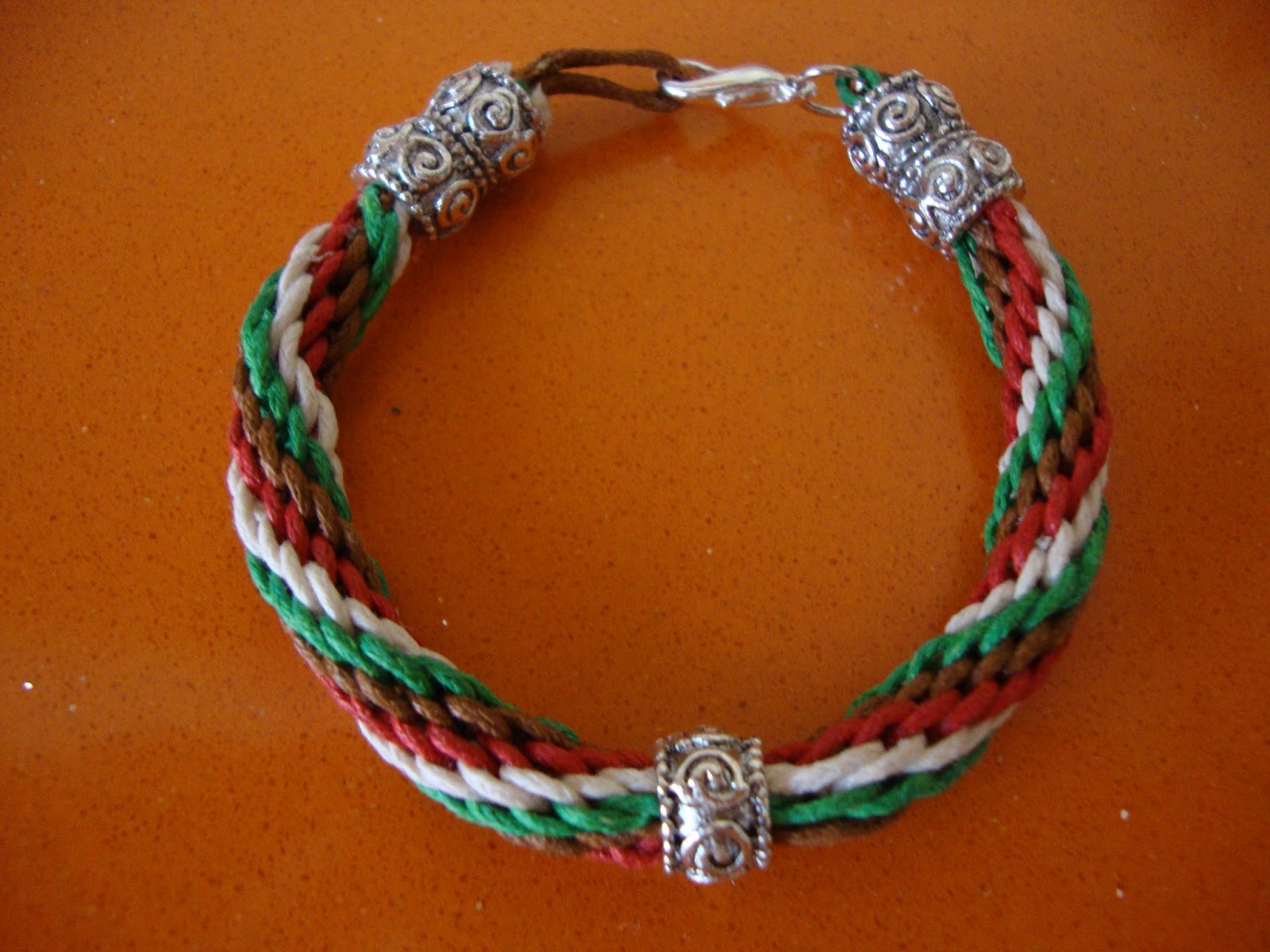 Como veis, a mitad de pulsera introduje un abalorio plateado. Lo haremos con cuidado de no descolocar las hebras, para ello las vamos pasando por el abalorio de una en una y colocándolas de nuevo en su posición. Cuando ya las tenemos todas dentro y el abalorio o abalorios e su sitio continuamos como si volviéramos a empezar.
