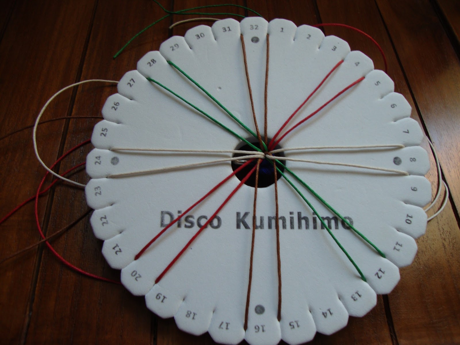 El trenzado básico, izquierdo sube, derecho baja. Vamos trabajando por parejas y girando el disco en contra de las agujas del reloj, cogiendo el color inmediato de la izquierda. En mi caso sería: marrón, rojo, blanco, verde y de nuevo marrón, rojo,...