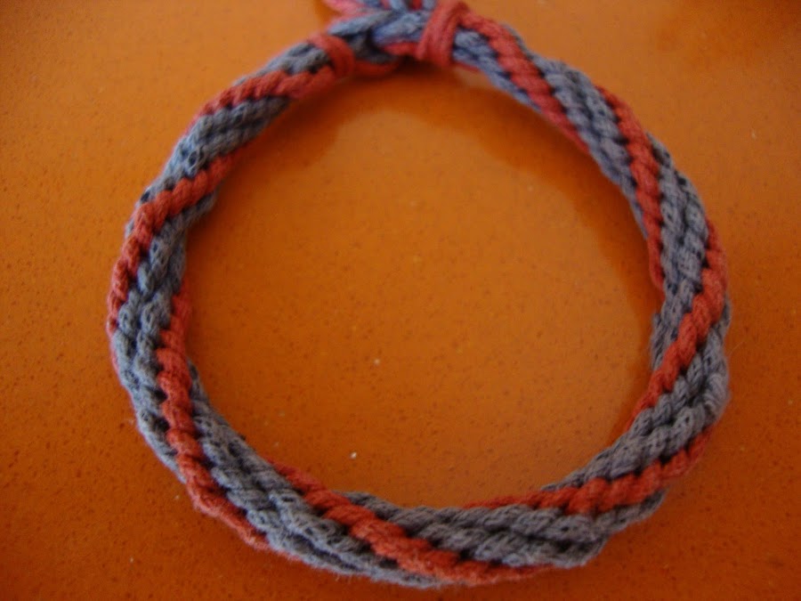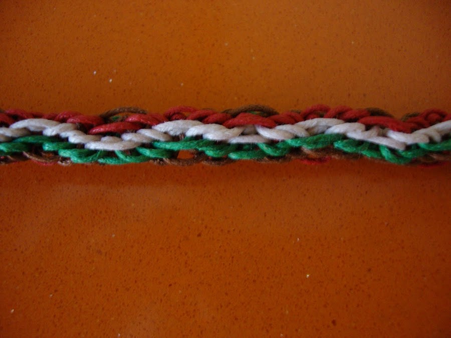 Con este sistema podemos lograr un efecto en zig zag en los cordones, por ejemplo cambiando el sentido cada 4 ciclos completos de colores. Os muestro cómo nos quedaría aunque con cordón encerado no se ve muy definido pero en los cordones de hilos queda perfecto.