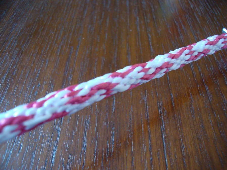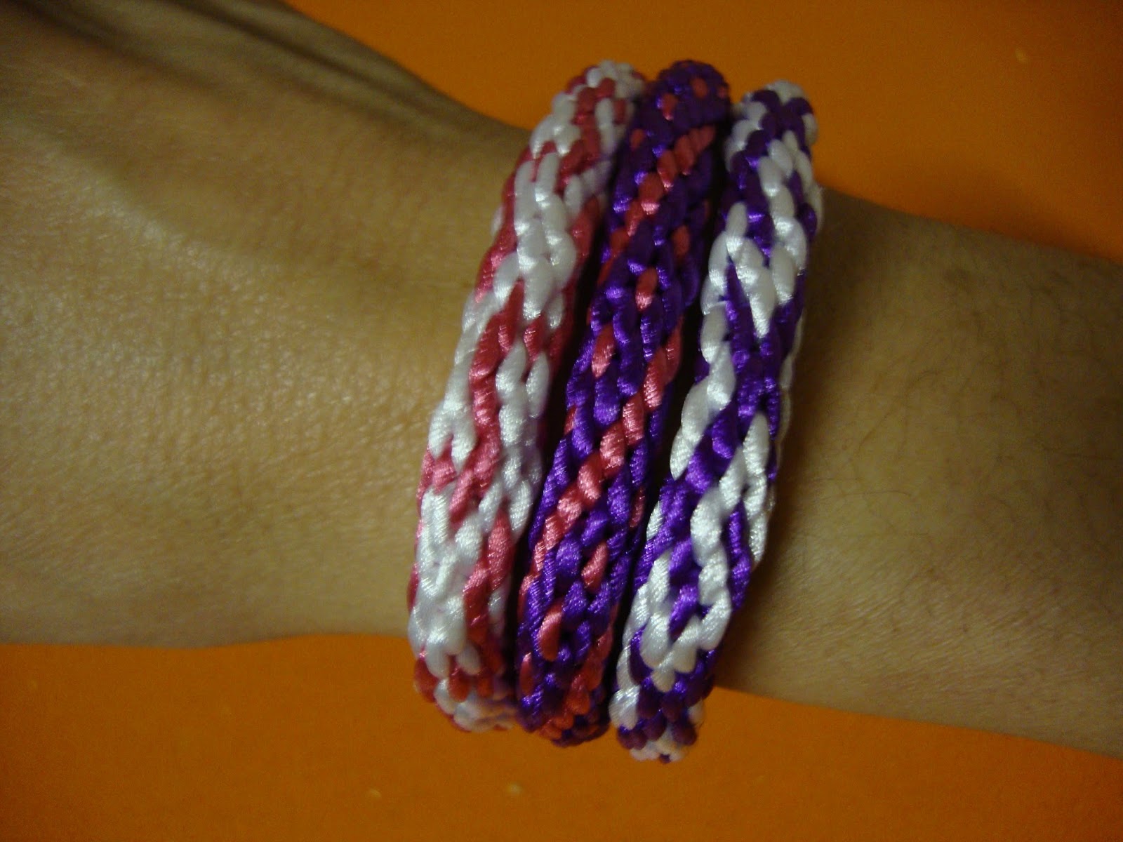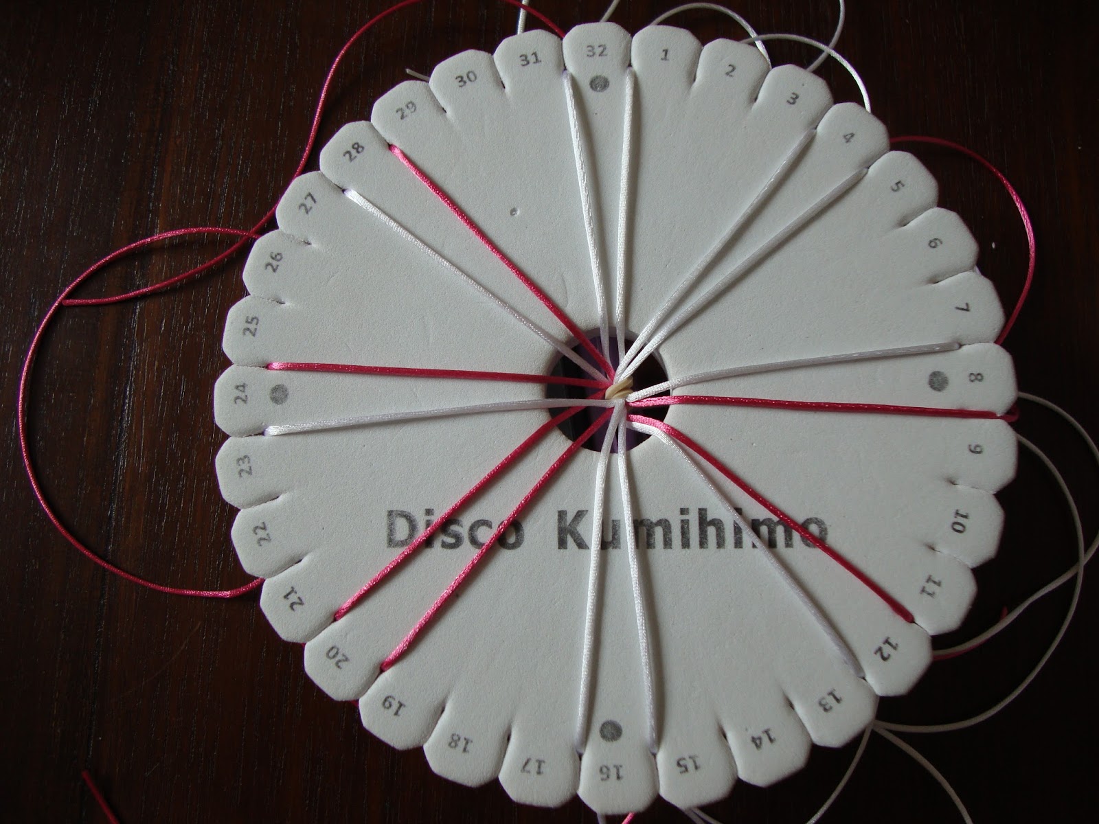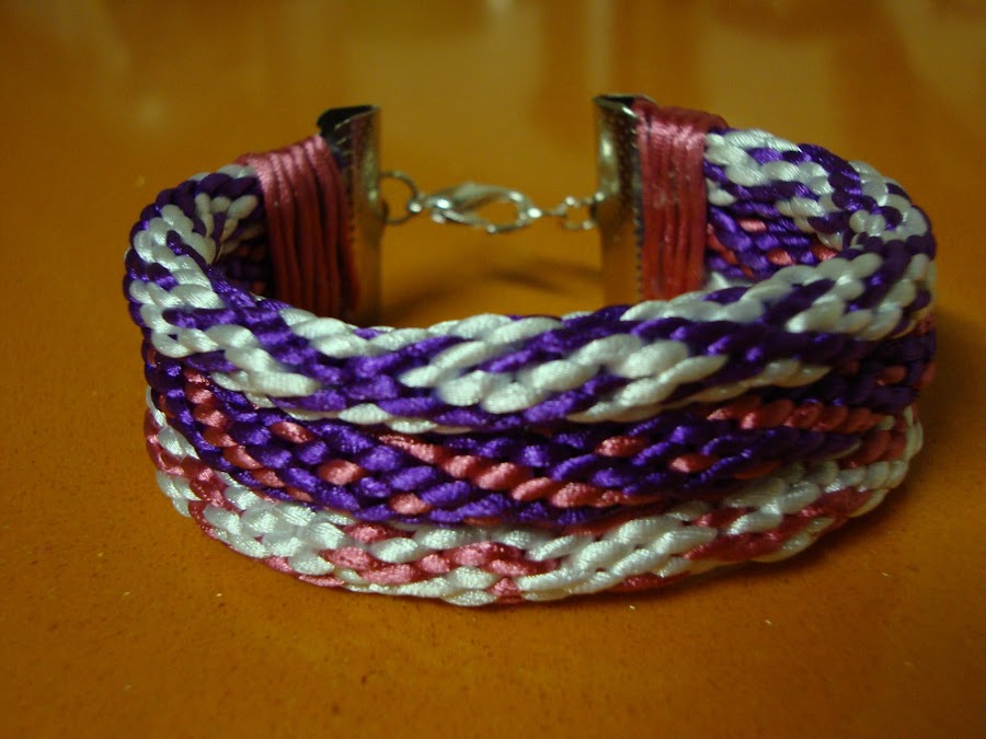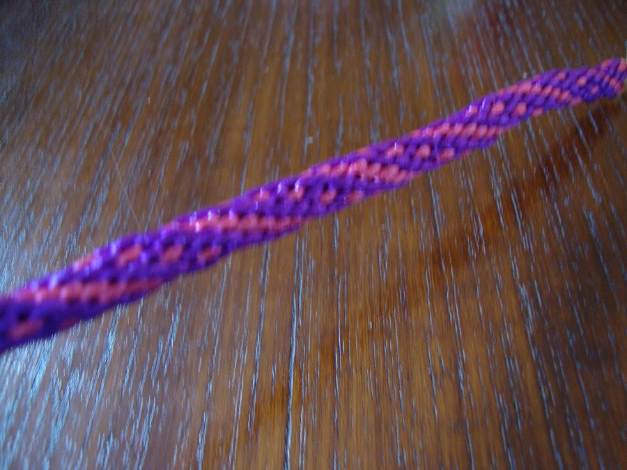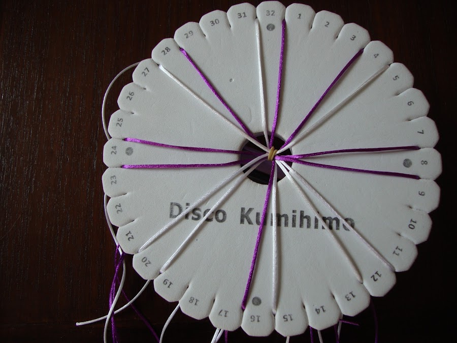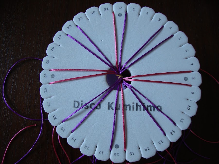 Son tres cordones de 16 hilos, tejidos del modo más habitual, ya sabéis, colocados en parejas enfrentadas, subimos el izquierdo y bajamos el derecho, pasamos a la pareja de al lado y repetimos, siempre igual. Seguimos el tutorial de la entrada Kumihimo V del blog (para quién no haya hecho nunca).