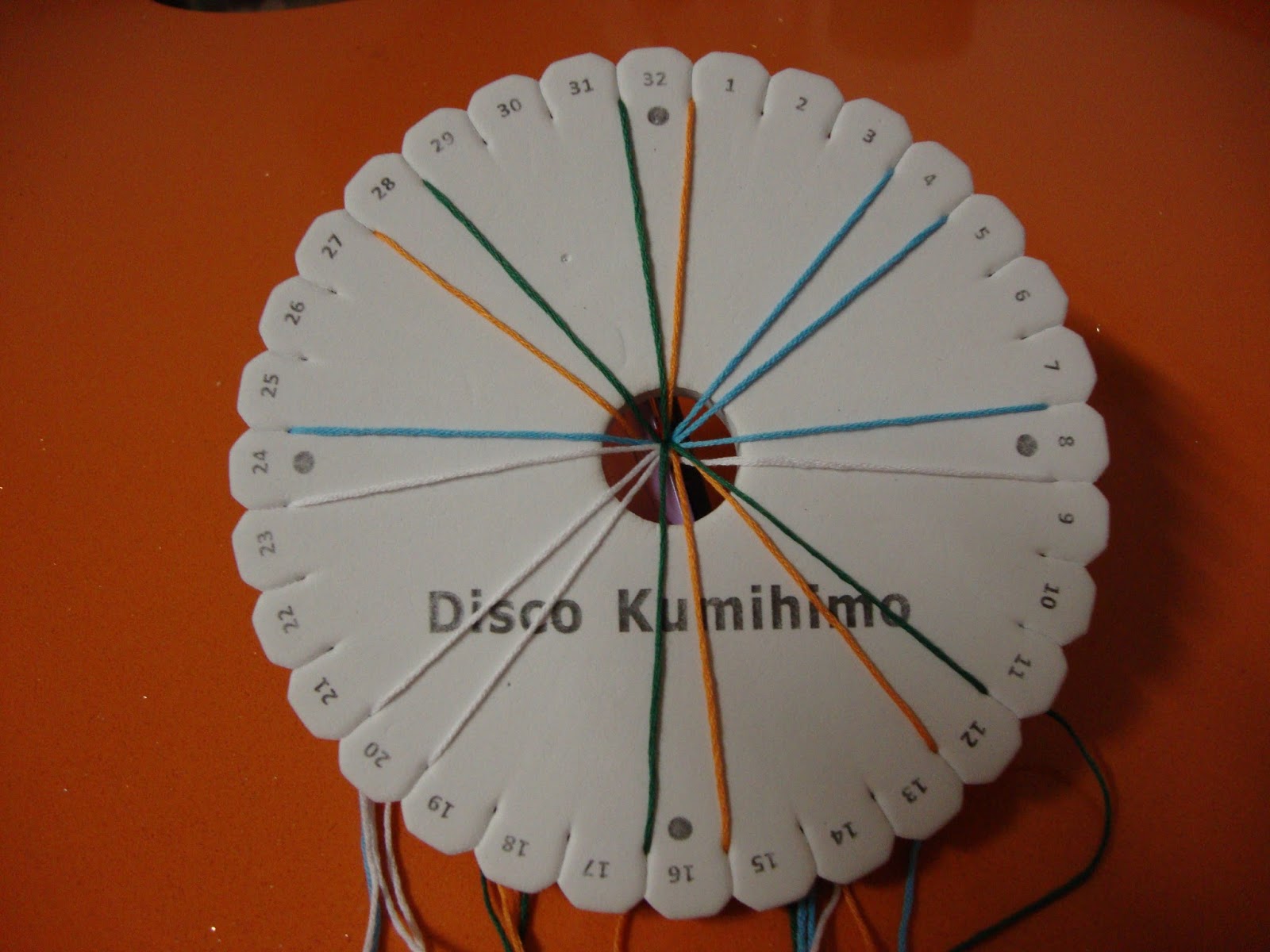 Para las que me habéis preguntado : el bucle inicial se forma al doblar las hebras. Como son pares, las cortamos el doble de la longitud deseada, por ej unos 60 cm, para que nos queden de cada una 2 de 30 cm. Las juntamos y anudamos (se pueden añadir al nudo hebras sueltas si son colores impares). Si no queremos hacer un nudo, las sujetamos con una gomita (o las cosemos con hilo) y con una pinza plana que asegure bien (yo tengo una pinza metálica con imán que me sirve a la vez de peso para tensar las cuerdas, antes usaba un imperdible y colgaba una pelotilla metida en una bolsita, lo que se os ocurra que sirva de peso). Este atillo es lo que queda bajo el agujero del disco; por encima sacamos las hebras para comenzar a distribuir los hilos en sus correspondientes ranuras.