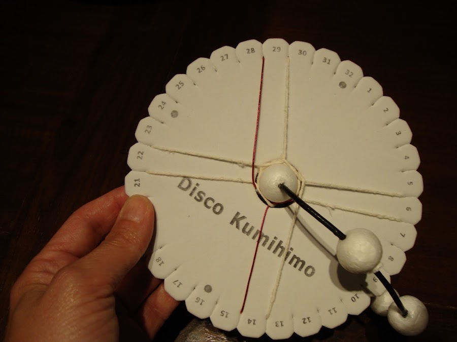 Y seguimos con el trenzado pero ahora con un obstáculo más a cubrir (ojo! el tamaño de la bola no puede ser más grande que el agujero del disco porque tiene que bajar por él). Revisamos la tensión del apretado y decidimos si pasamos la bola en más o menos vueltas en función de si queremos que quede un poco a la vista o preferimos cubrirla al máximo con el tejido.