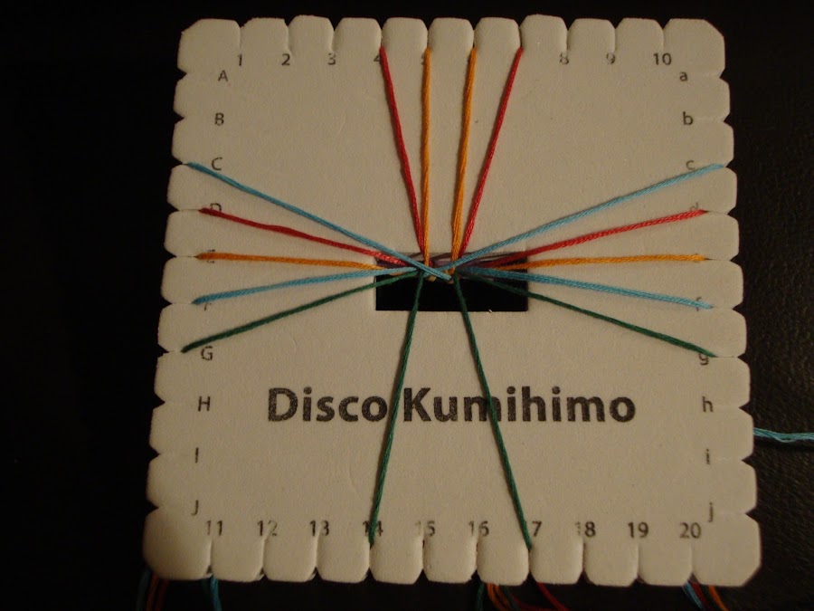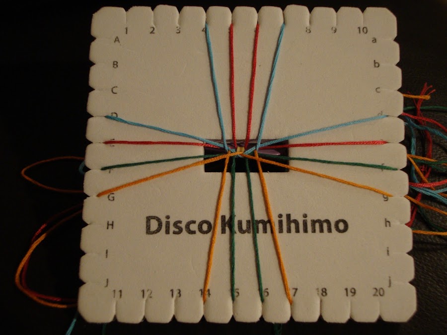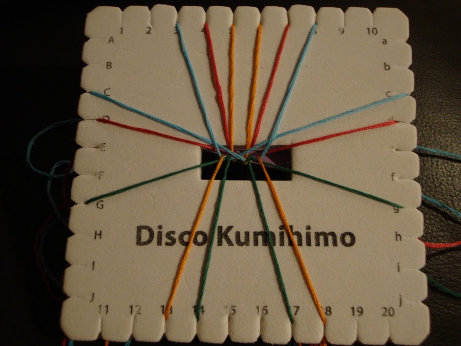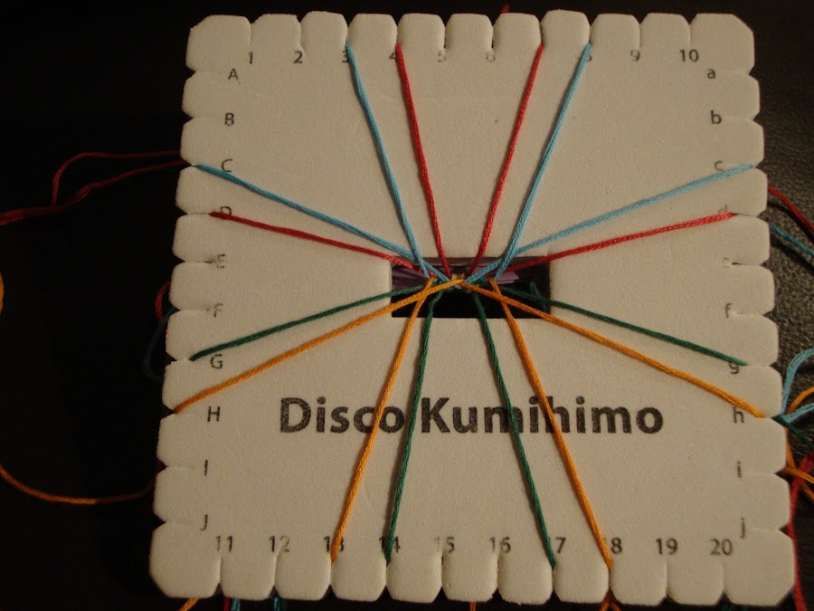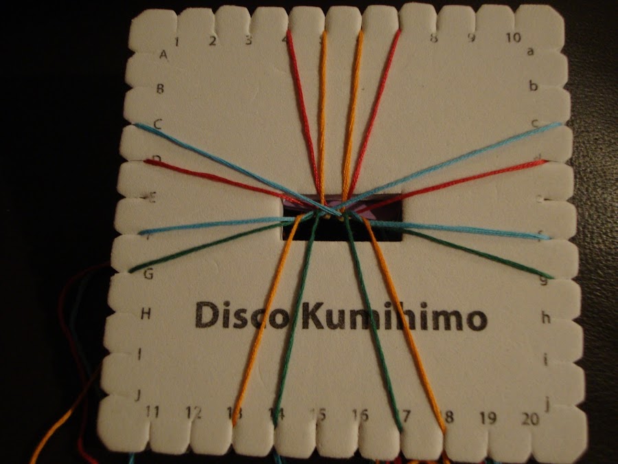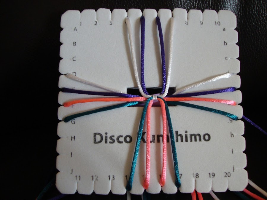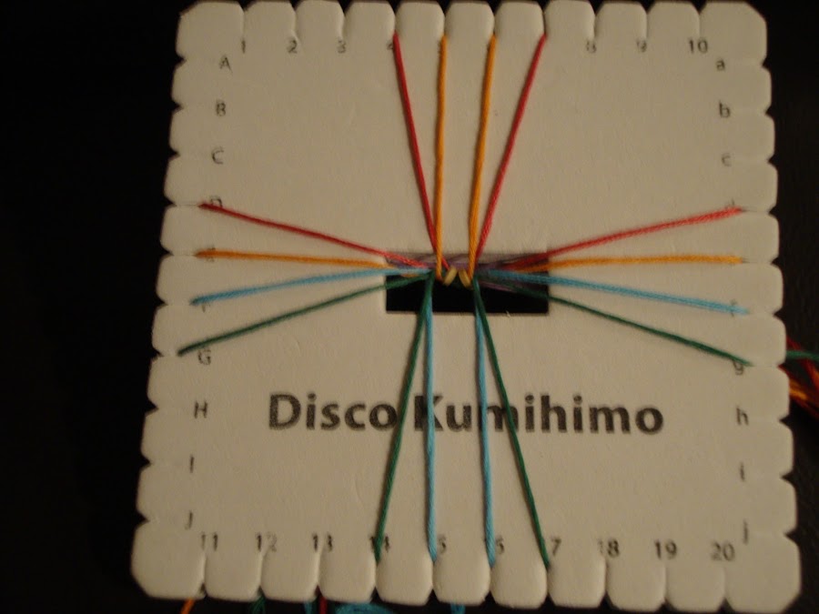 El primero son unas pulseras planas con tejido en espigas. El trenzado es similar al que mostré en la entrada pulsera de corazones, pero en este caso vamos a emplear 16 hilos, 4 a cada lado del disco cuadrado.