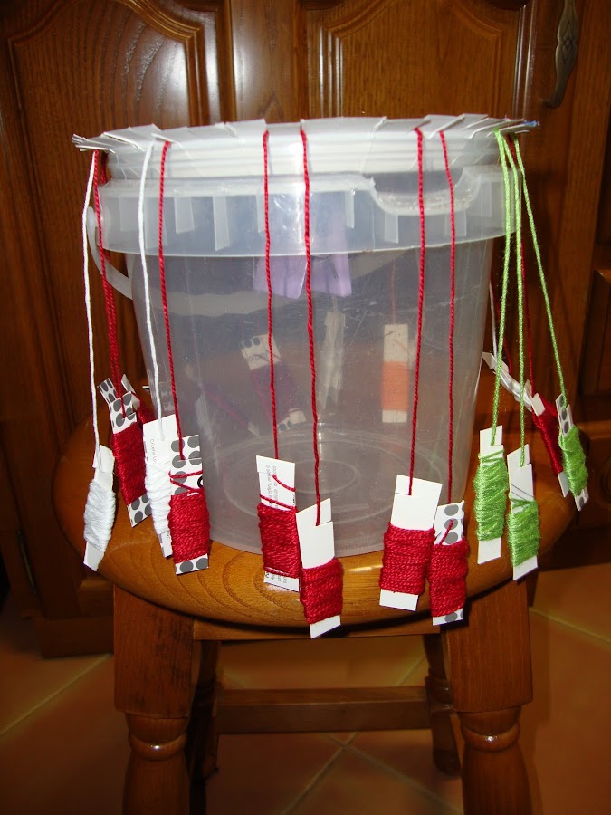 Tercero, coloqué el plato sobre un cubo de plástico de un diámetro similar que me mantenía los hilos separados colgando alrededor y me permitía trabajar a dos manos e ir girándolo. Es lo más cercano que he logrado a un kumihimo original (si los habéis visto son como taburetes de madera con un orificio central).