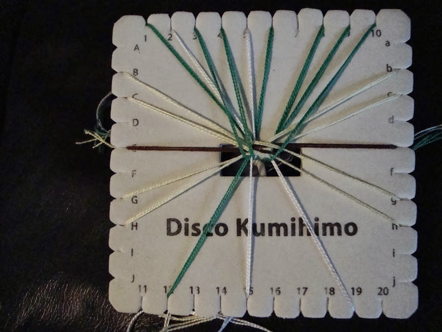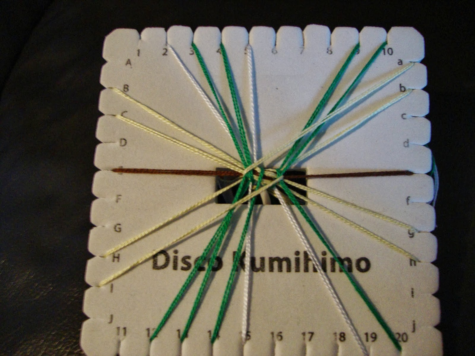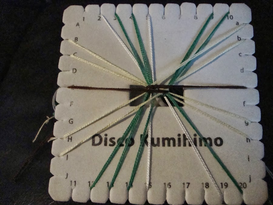 Comencé practicando el primero con una muestra de hilos que es la que os enseño en fotos con el paso a paso. Aunque es un cordón que se podría hacer en el disco redondo, el esquema a seguir se entiende mejor y resulta más didáctico con el cuadrado.