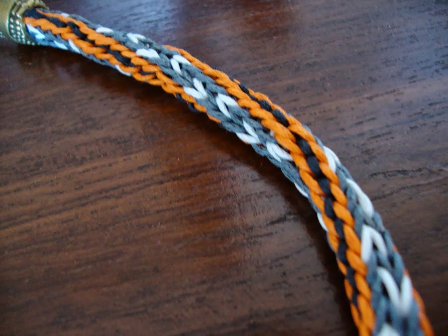 El primero es un cordón de corte ovalado, trenzado con 22 hilos. El dibujo forma espigas centrales por delante y detrás separadas a ambos lados por 3 columnas rectas. En este ejemplo combinamos 2 colores en la espiga de manera que se forma un dibujo, éste puede variar si combinamos los hilos de otro modo.