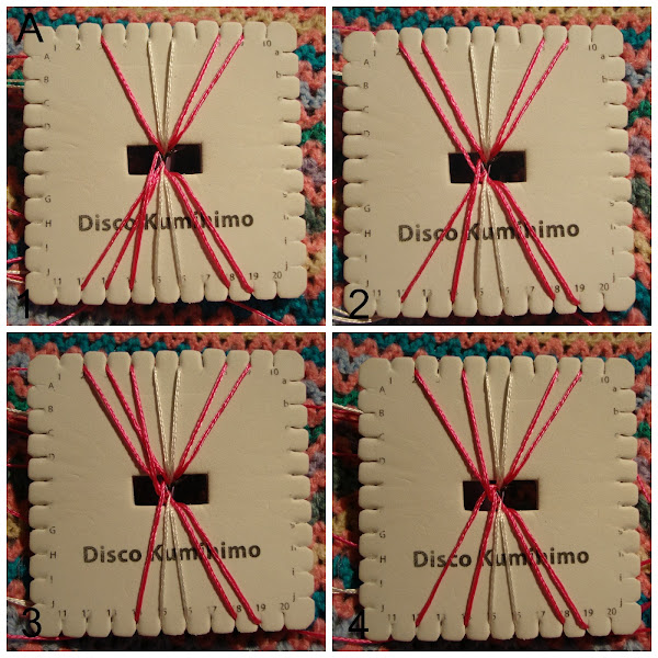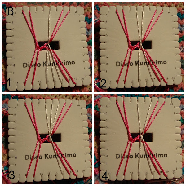 Decía que el reto era un poco más complicado porque se va tejiendo a tramos para poder dar forma a los eslabones, para ello se trabaja con los hilos por parejas de dos en dos (izquierda/centro/derecha), repitiendo el mismo movimiento antes de pasar de una pareja a la siguiente y tenemos que concentrarnos más para no perdernos y estropear el resultado.
