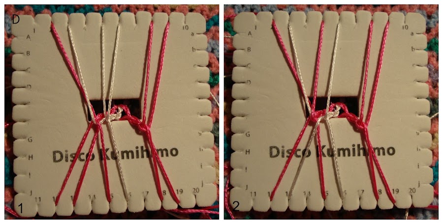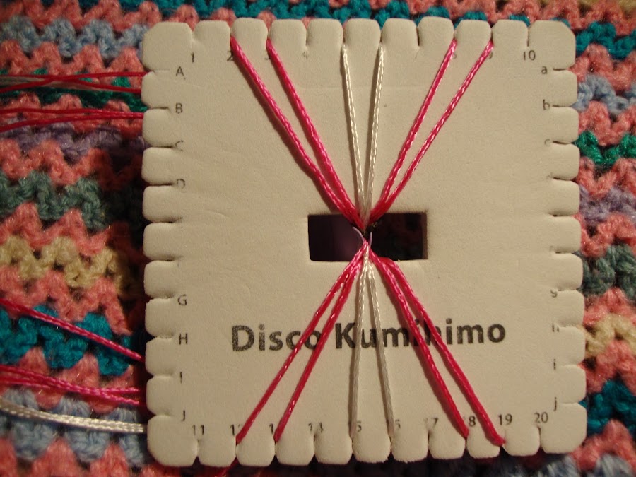 Partimos de 6 hebras dobladas por la mitad, total 12 hebras: en mi caso escogí 8 en rosa y 4 en blanco (como siempre, colores y distribución a gusto para obtener variantes).