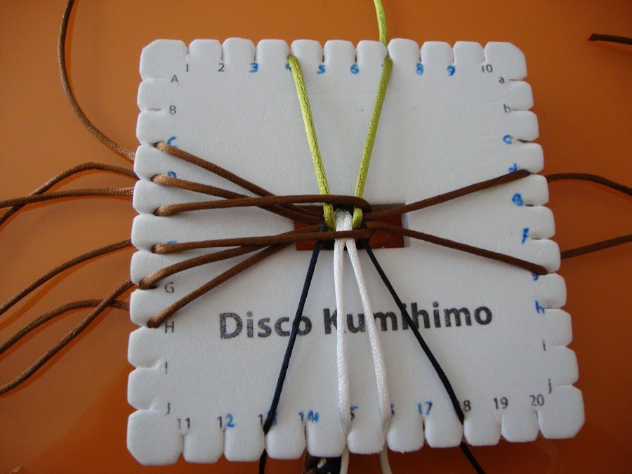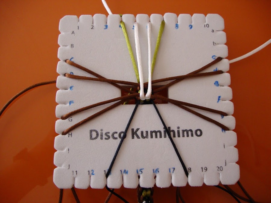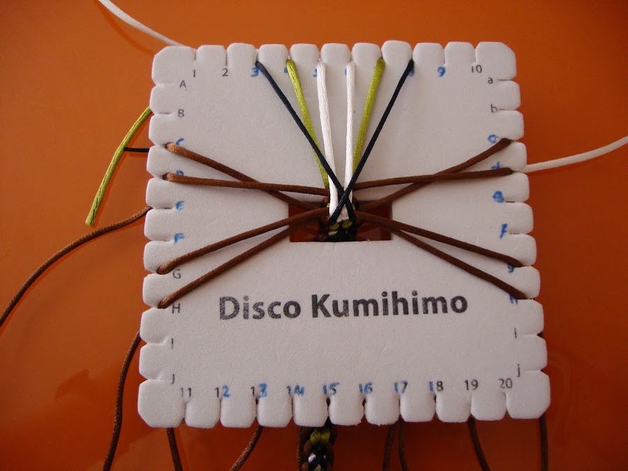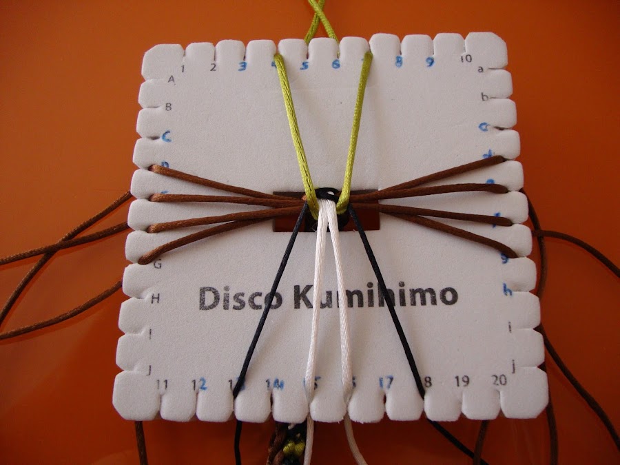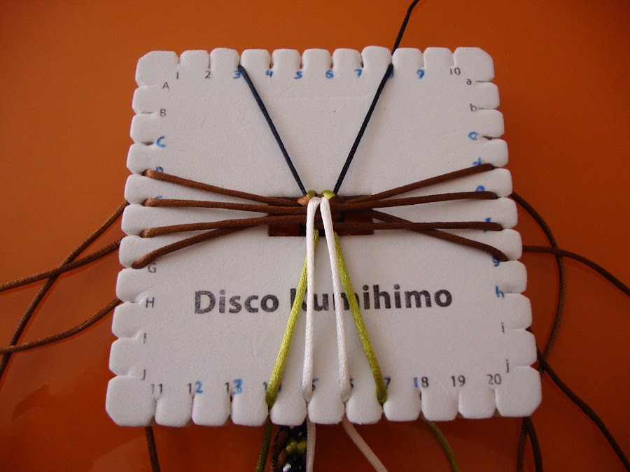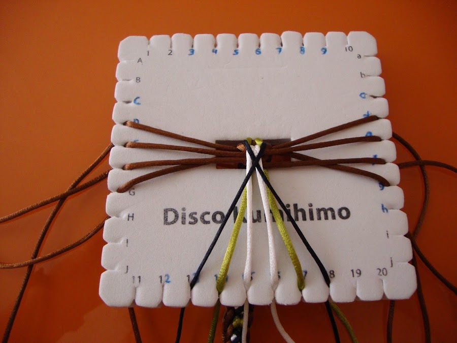 Es un trenzado de 14 hilos, usaremos 7 doblados por el centro (que, como siempre, pasamos por el hueco del disco humihimo y fijamos tensando con un peso). En mi caso empleé 8 marrones, 2 verdes, 2 blancos y 2 negros. Esta pulsera está hecha con cola de ratón, empleé hebras de 85 cm dobladas.