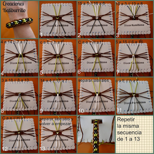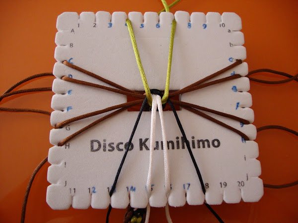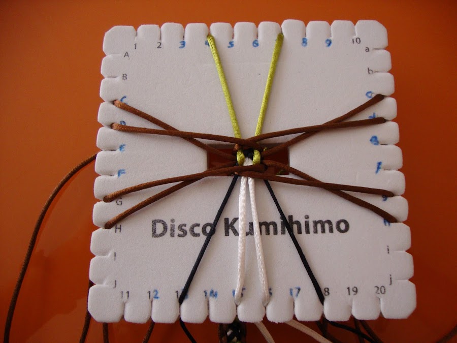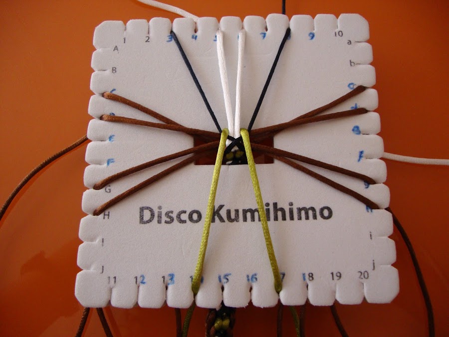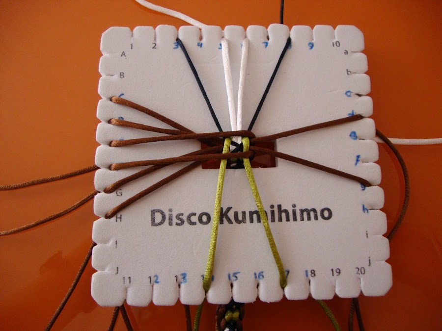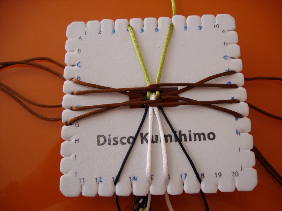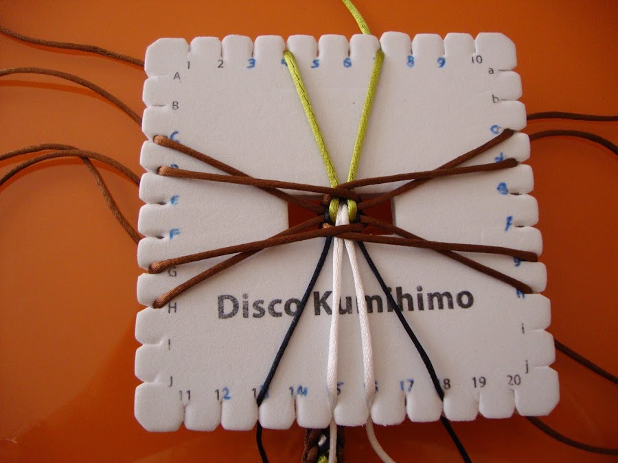 Es un trenzado de 14 hilos, usaremos 7 doblados por el centro (que, como siempre, pasamos por el hueco del disco humihimo y fijamos tensando con un peso). En mi caso empleé 8 marrones, 2 verdes, 2 blancos y 2 negros. Esta pulsera está hecha con cola de ratón, empleé hebras de 85 cm dobladas.