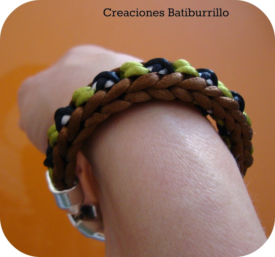 La hebra blanca quedaría mejor más gruesa, porque así forma como unos botones que sobresalen con el aspa encima, os animo a que probéis con cordones de texturas y grosores diferentes porque los resultados son superchulos.