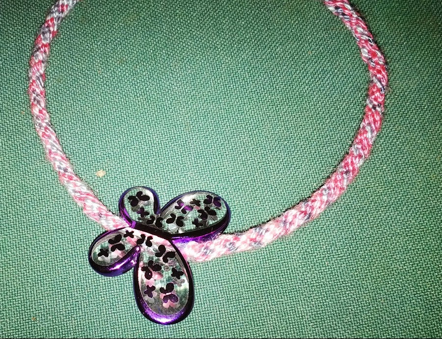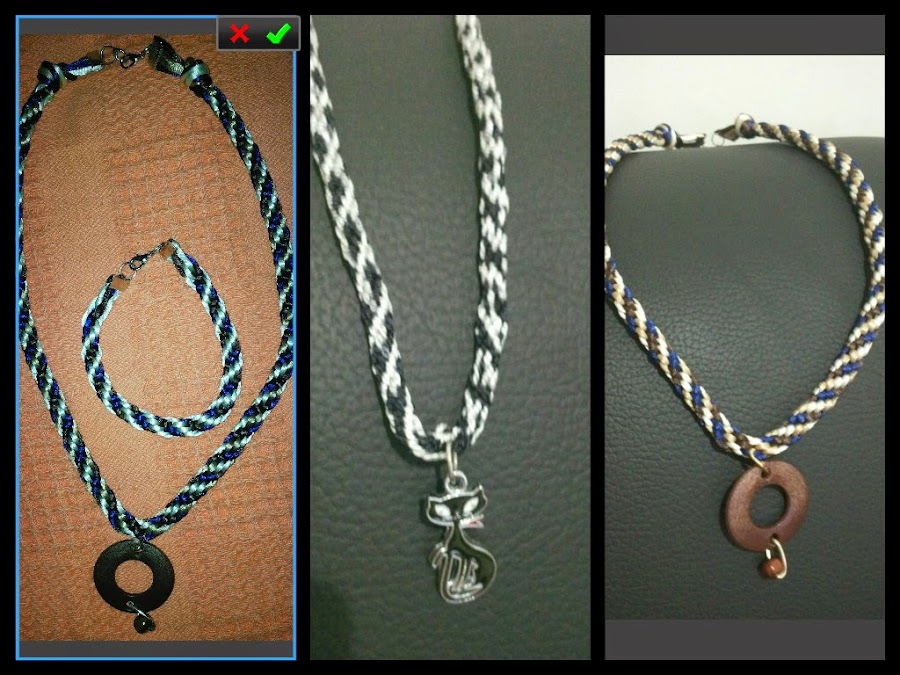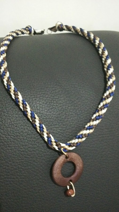 He hecho un montón de pulseras con la técnica del Kumihimo, pero tenia ganas también de hacer un collar combinado con cadena en los cierres. Me gusta mucho esta manera de hacer pulseras o collares porque con el Kumihimo, puedes hacer las combinaciones de colores que quieras, con las formas o dibujos que se desee y por supuesto, admite todo tipo de hilos o cordón. Me ha salido bastante chula ...