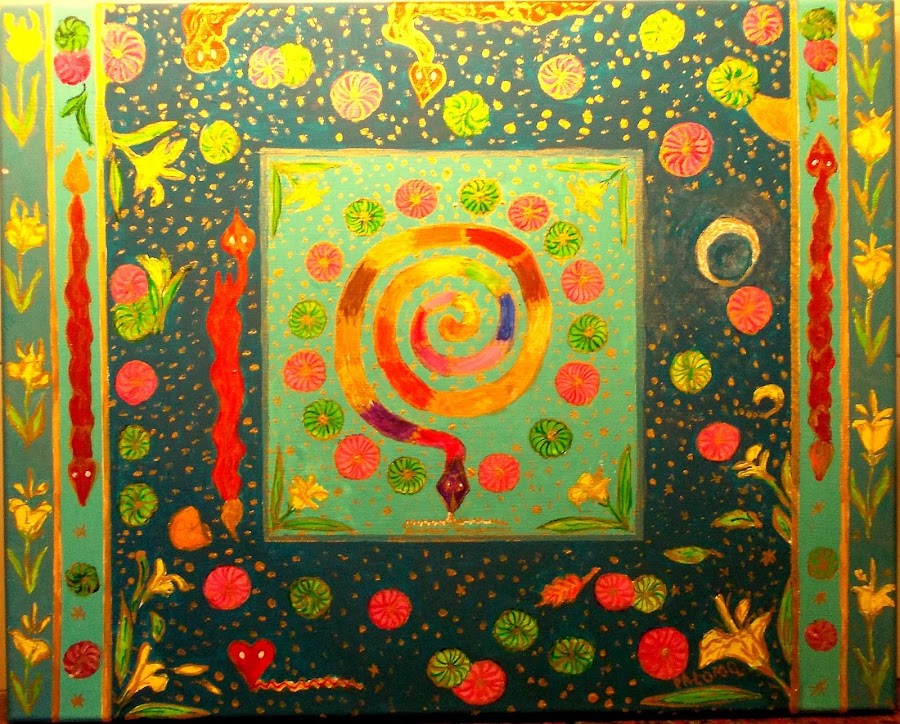 KUNDALINI....acrilico 40x50cm en acrilico sobre tela .Texto de Arub Aisha El kundalini es una energia wue controla vida y muerte, nuestra artista Maria Luisa Palomo nos cuenta que en el marco del induismo esta representada por una serpiente. Es el chakra # 1 (o vortice de energia en el cuerpo humano)y es el chakra del amor y el sexo. Por lo que re refiere a la tierra. Es el chakra de vida y muerte. Los chakras son vortices de energía y los colores aquí están representando distintas fases de vida. Los amarillos y naranja son la calidez del sol. Se requiere para hacer germinar toda la flora y también la necesita para su reproduccion casi el total de la fauna. Aunque esta obra nos habla en especial de la flora. Maneja los cuatro lados. Montados uno con otro 4 veces. 4 cuadrados. Con 4 lado. Son sin duda un número mágico. Son 4 las estaciones. Y 4 los elemento, 4 los rey nos que existen y cuatro Estados del hombre. El cuatro es el número del hombre y la materia. Esta obra y la serpiente kundalini. Representan vida y reproducción. Muchas gracias María Luisa Palomo por tus verdes de la vida. Amarillos de alegría. Naranjas de calidez y rojos de pasión porque se logre todo con una total precisión. Muchas gracias por compartirnos tu trabajo y tus bellezas.