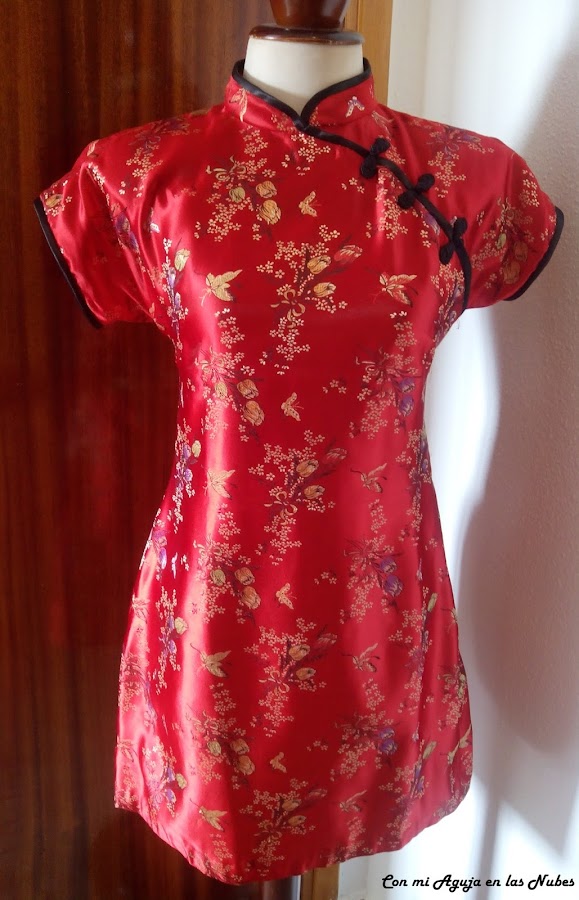 Mi qipao está confeccionado en seda roja con estampados florales. De corte entallado, manga corta y largo hasta la rodilla, he eliminado las típicas aberturas laterales de los qipaos tradicionales. El cuello es cerrado, tipo mao y está adornado, al igual que las mangas, con una cinta bies de raso negra. Además, está decorado con tres cierres trenzados, también en color negro. Espero que os guste.