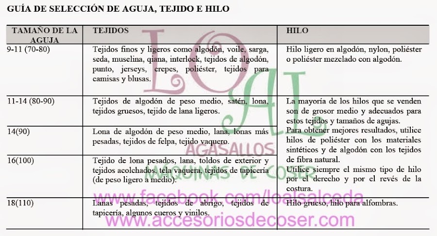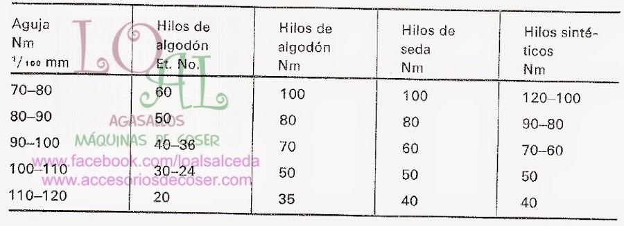 Otra tabla para guiarnos que podemos usar es esta que aparece en el manual de la máquina de coser Alfa 650 :