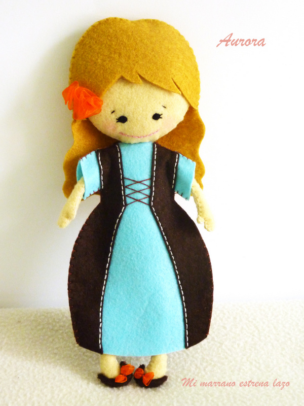Aurora esta realizada en fieltro, rellena de fibra de peluches y cosida totalmente a mano. La altura de la muñeca es de unos 24 cm.