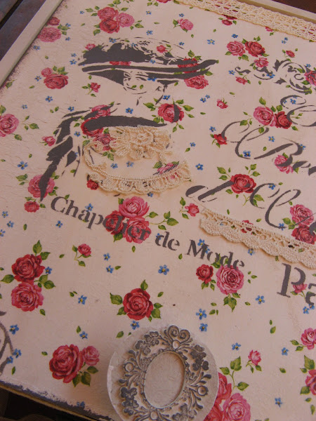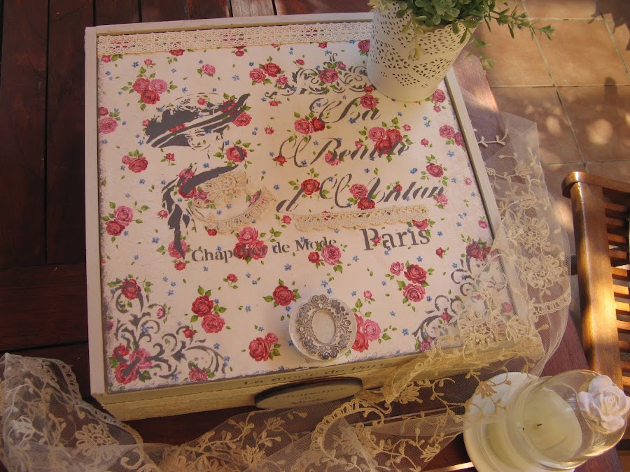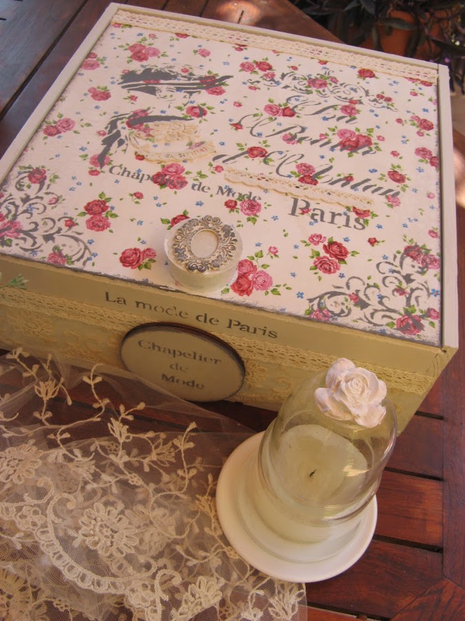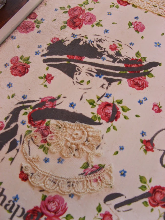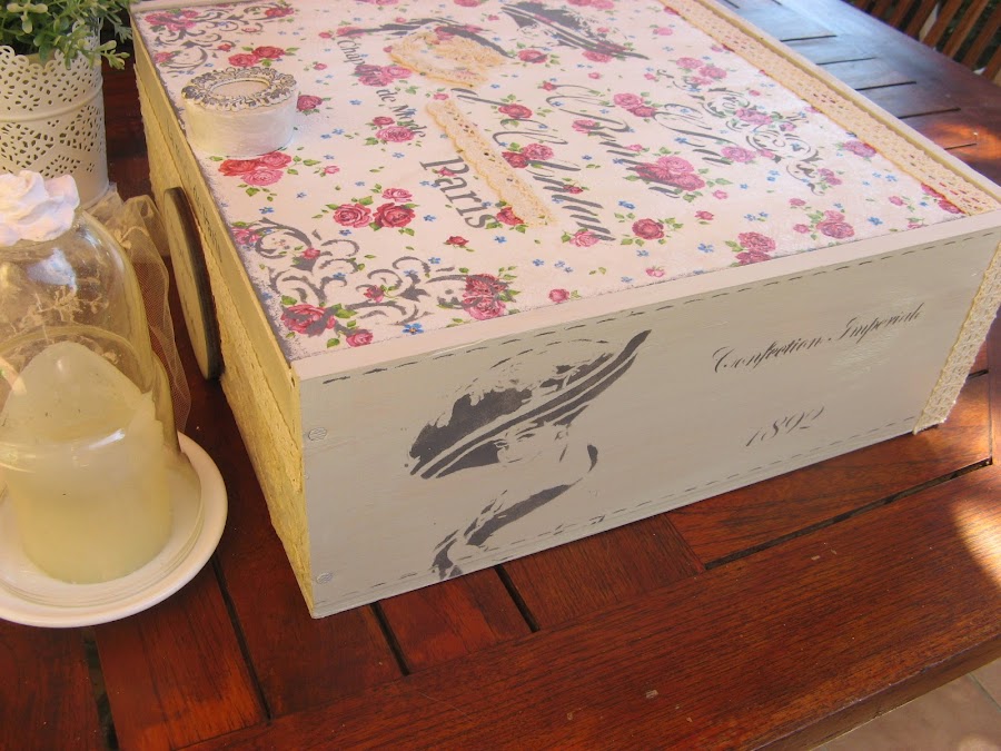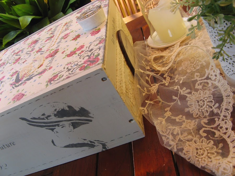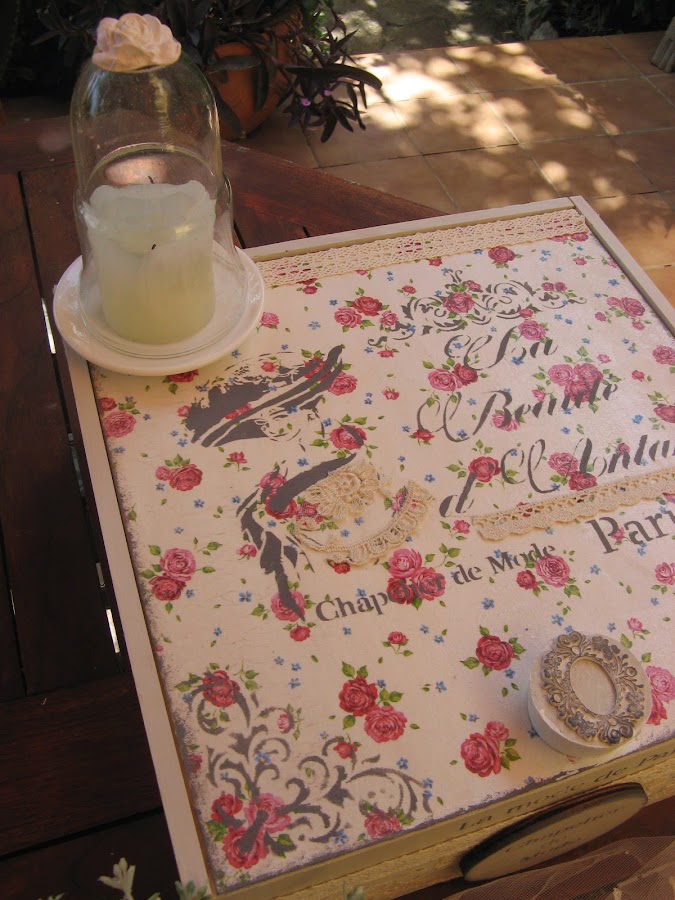 los bordes de la tapa van sombreados con esponjita y la misma acrilica gris oscura con la que he hecho los estarcidos.