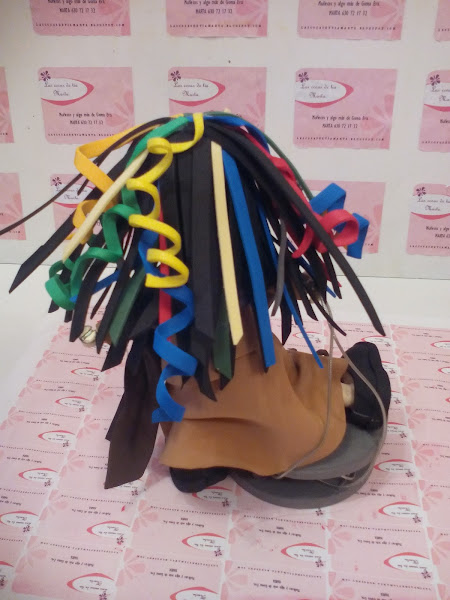 9. Cortamos un círculo que usaremos de nariz y tiras de colores para el pelo.