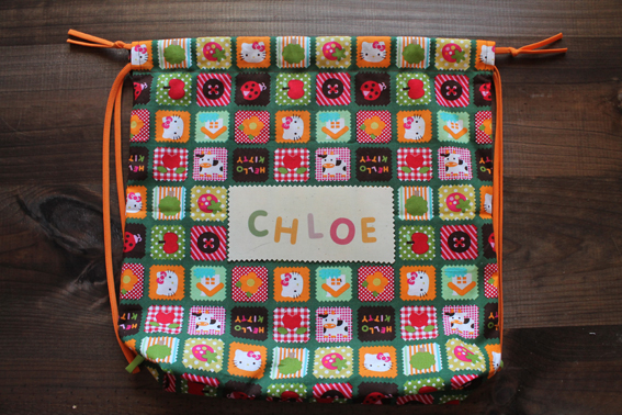Y, lo más especial de todo y que le da el "toque" a la bolsa: el cartelito con su nombre. Para ello utlicé la técnica del transfer que expliqué aquí. Quise que las letras fueran lo más parecidas posible a las que vienen impresas en la tela, así es que hice un llamamiento en Twitter preguntando si alguien sabía qué tipografía era. Me respondió Una Mamá Diseñadora, con una similar, que adecué (girando cada letra), y a la que puse los colores lo más similares que pude.