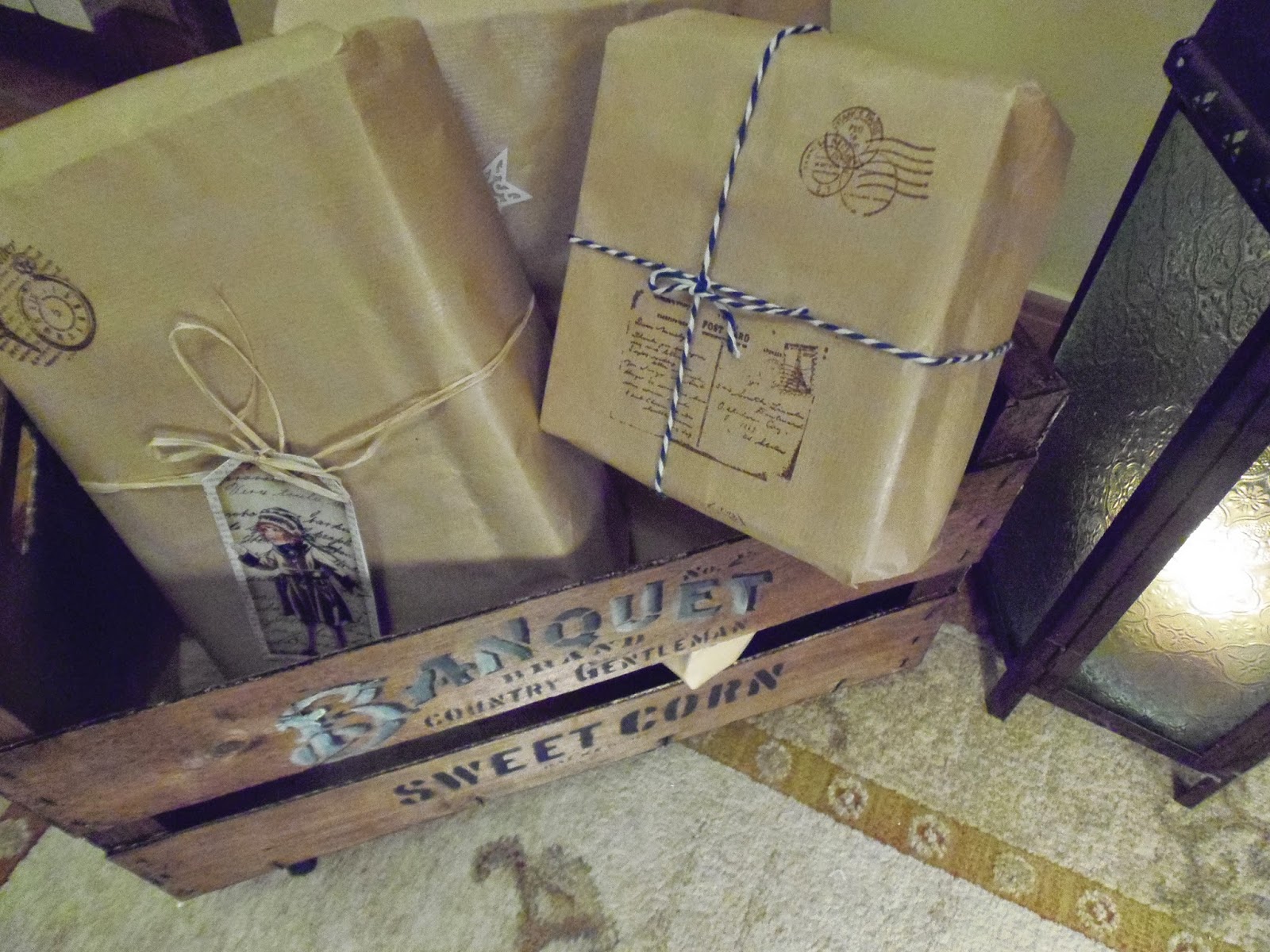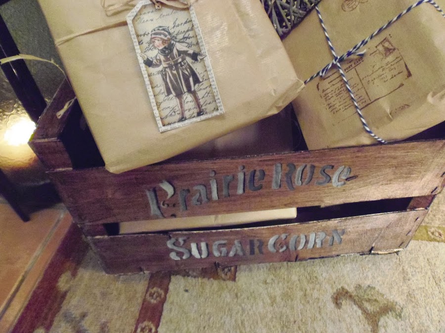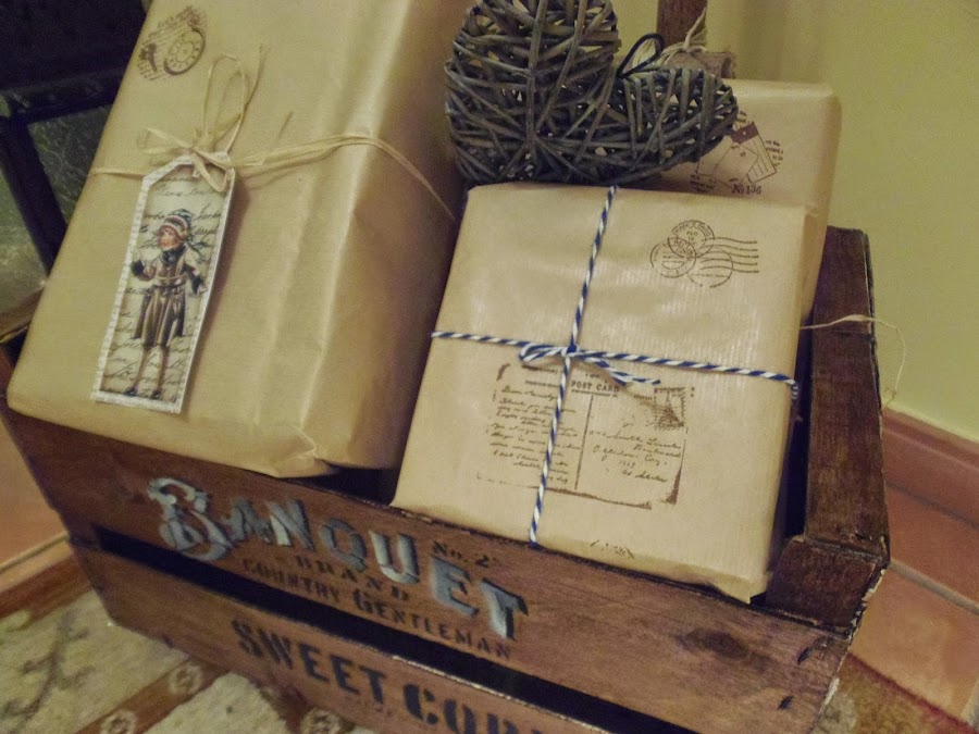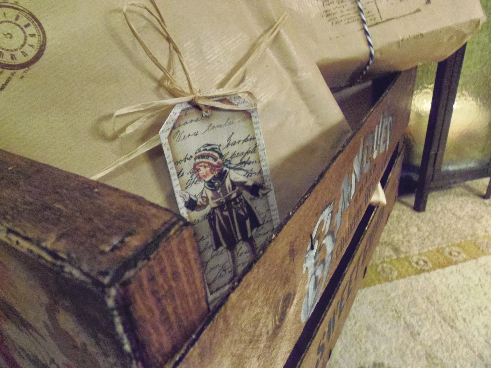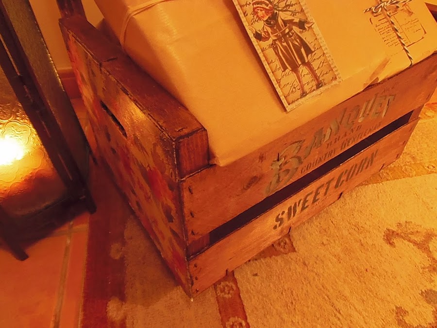 Una caja de fruta teñida de color castaño y barnizada,adornada con stencil en el frontal y unas ruedecitas alberga regalitos de Navidad