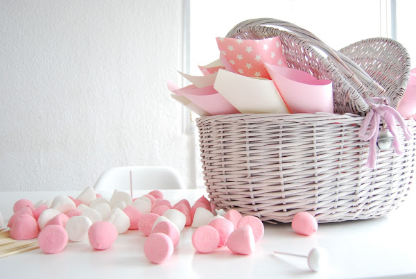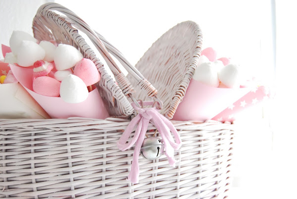 Se pueden colocar las chuches directamente en la cesta pinchándolas en corcho blanco (y seguramente algún día lo haremos así) pero en esta vez me pareció más acorde con la ocasión que colocar las golosinas en pequeños "ramos" dentro de cucuruchos que preparamos con cartulinas pequeñas (tamaño folio).