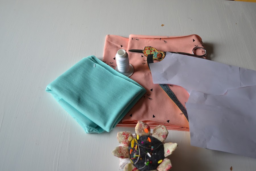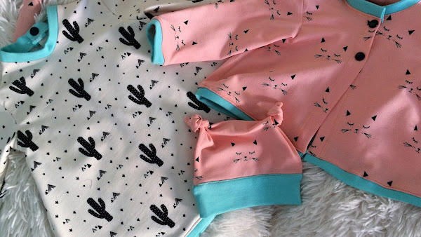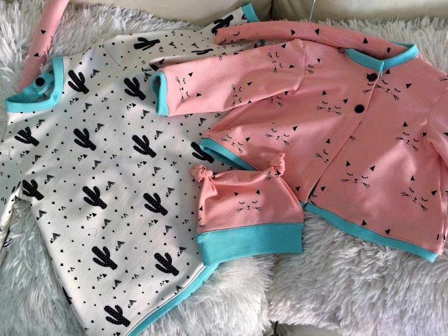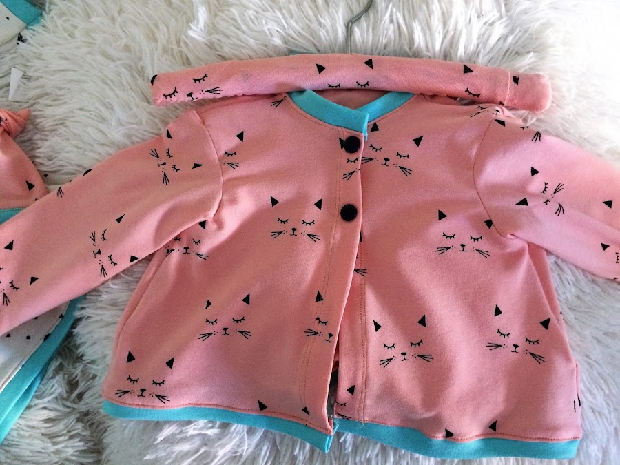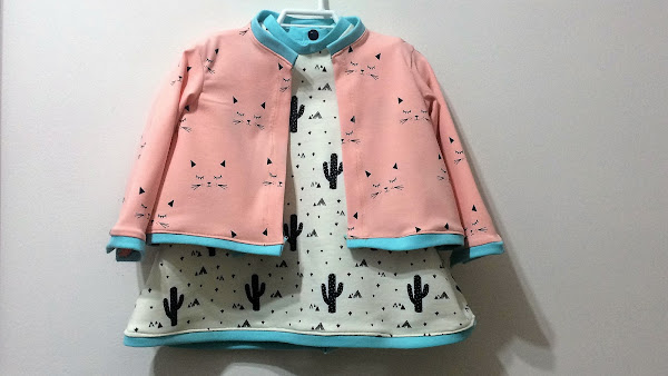 Para la chaqueta elegí una tela de naturtelas también, esta vez de estampado gatitos y puse los puños, escote y bajo en la misma tela verde agua de puños que el vestido, para que hicieran juego.