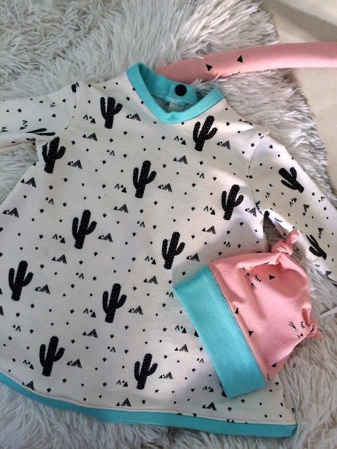 Aunque como me sobraba un poquito tela yo al final hice también un gorrito con la tela de gatitos y con la tela de puño y ha quedado fantástico.