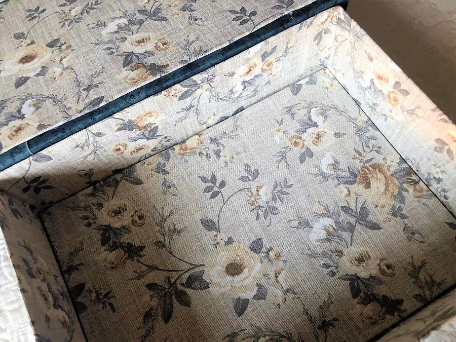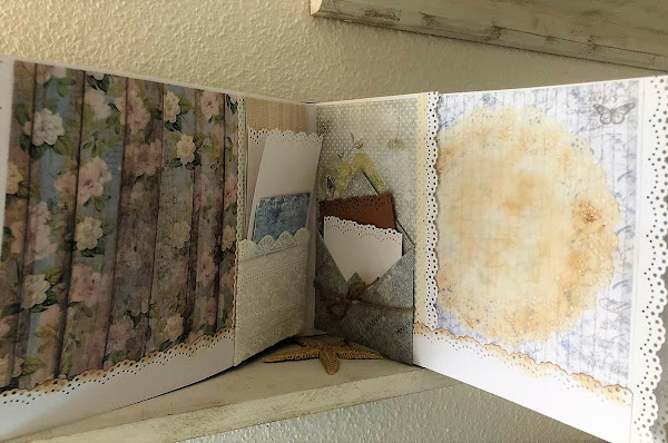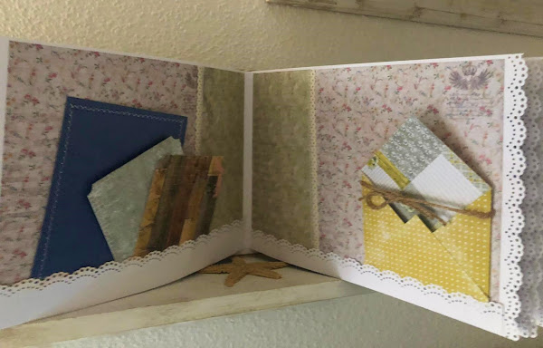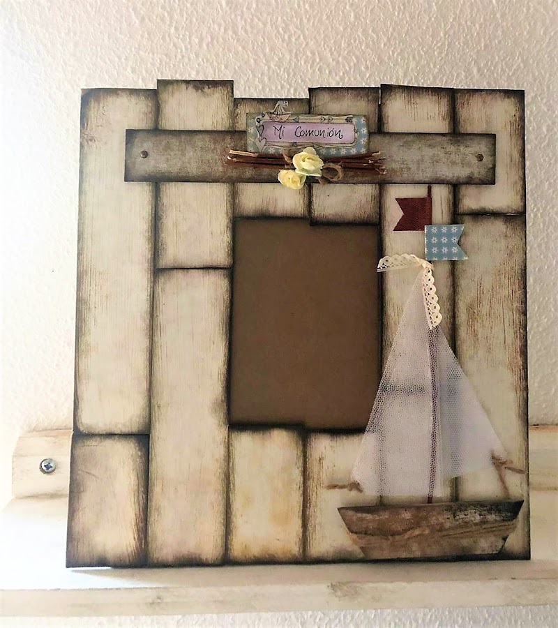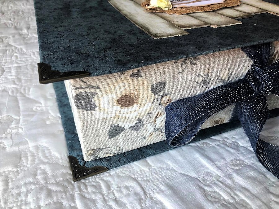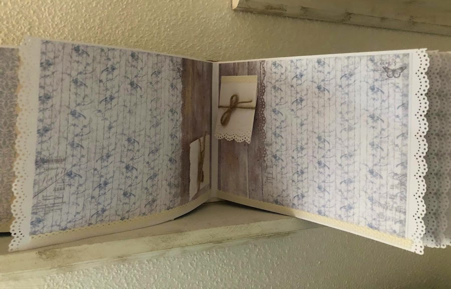 Azules, cremas en los papeles, toque rústico con listones simulando madera, blondas envejecidas, puntillas y adornos florales.
