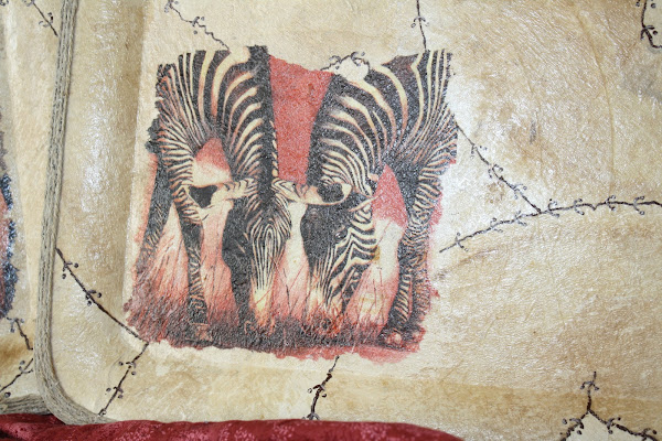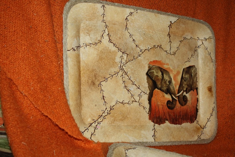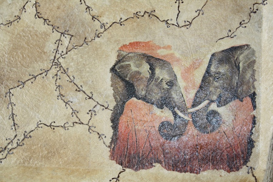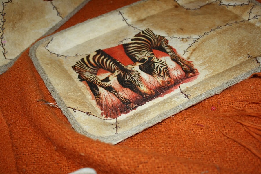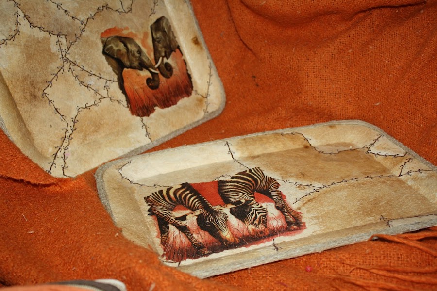 Muy sencillito el reciclaje, un par de manos de imprimación, luego la técnica del falso cuero (aquí tenéis el paso a paso ) reciclando filtros de café, para terminar un decoupage muy """animal"""" que queda genial con este tipo de técnica y bastante barniz para protegerla.