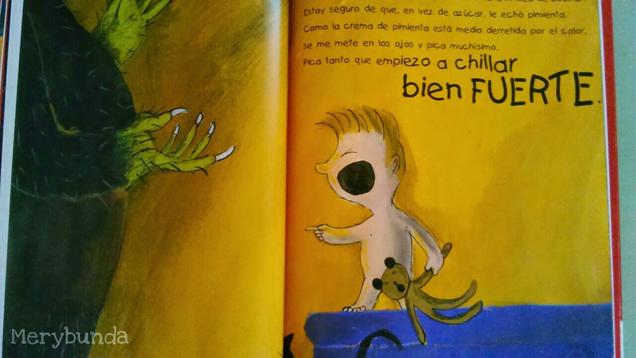 No debe de ser muy buen cocinero, porque le cae en los ojos, y pica como la pimienta, por lo que el niño se pone a llorar. El monstruo le canta, bastante mal, por cierto.