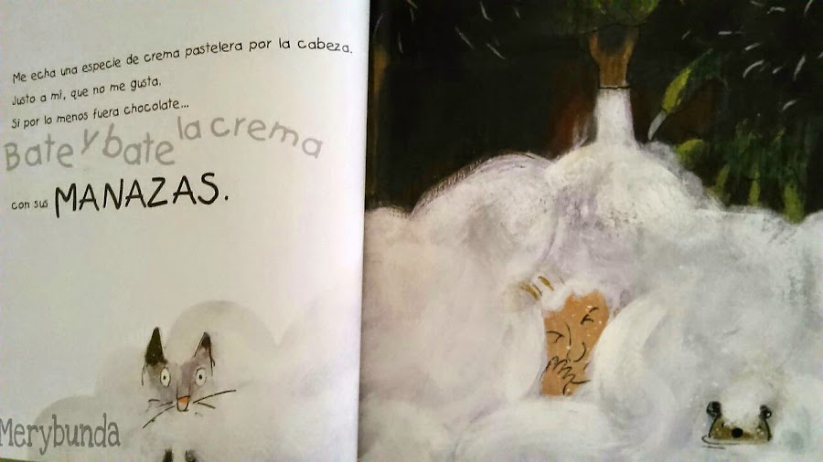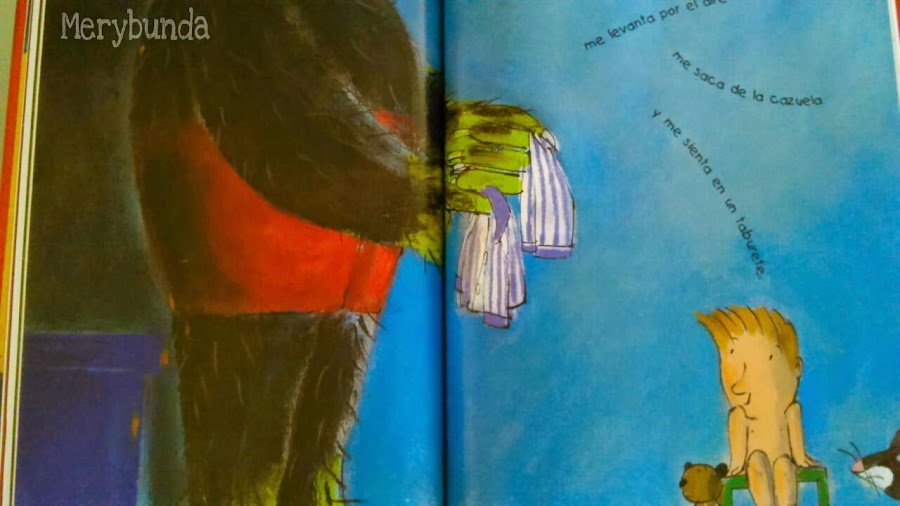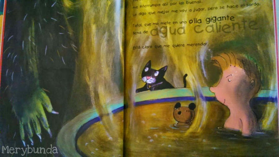 Pobre monstruo, le ha salido mal la receta y tiene que limpiar toda la crema pastelera. Saca al niño de la hoya, cuando ya está convencido que va ha ser devorado, el monstruo le pone un pijama calentito y lo abraza...