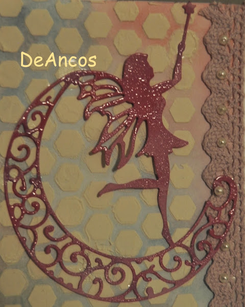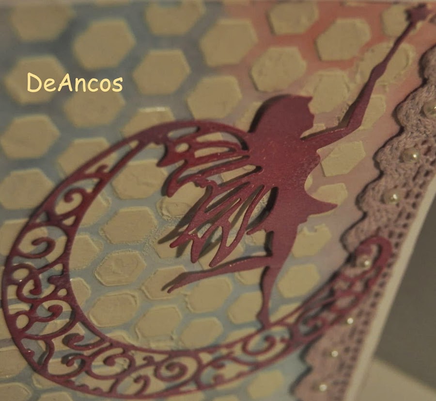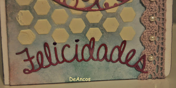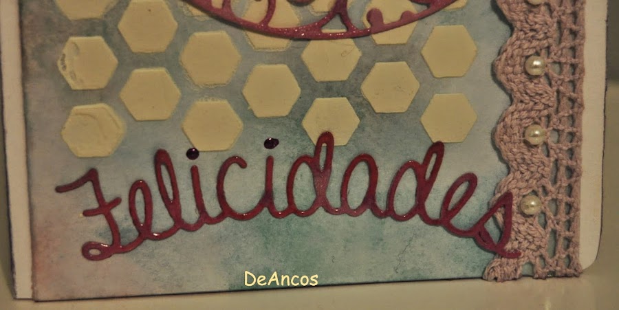 El troquel de hada de Cheery Lynn y la palabra "Felicidades" de Latina Crafter están embosados con polvos transparentes. A la puntilla adhesiva le añadí unas perlitas para darle un toque de elegancia al conjunto.