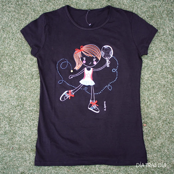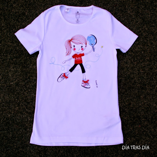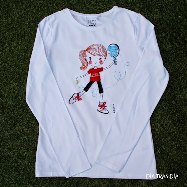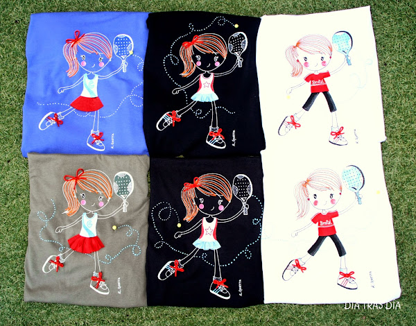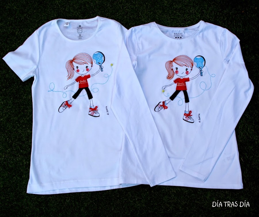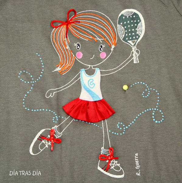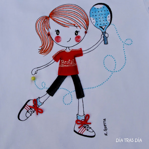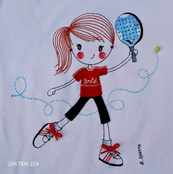 En esta ocasión os quiero enseñar un nuevo modelo de Ro-ro que se incorpora a esta gran familia y que ha surgido de la cabeza de mi buena amiga Conchy. Hace pocos meses, ella comenzó a jugar al padel así que me dijo que quería que le hiciera un conjunto de camisetas con Ro-ro jugando a este deporte porque, palabras textuales suyas, "no pensaba ponerse otra cosa para jugar";-)