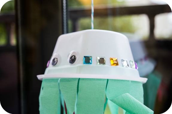 Unas medusas la mar de simpáticas hechas con tiras de papel de seda, boles de plástico ( de estos de usar y tirar que se usan para la comida) y ojos móviles. Para aportarle algo mas de colorido y festividad le pegamos unos cristales de colores.