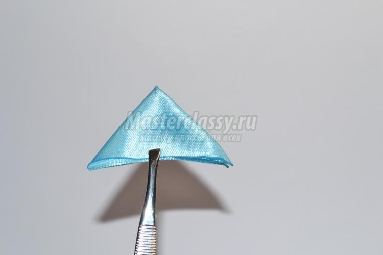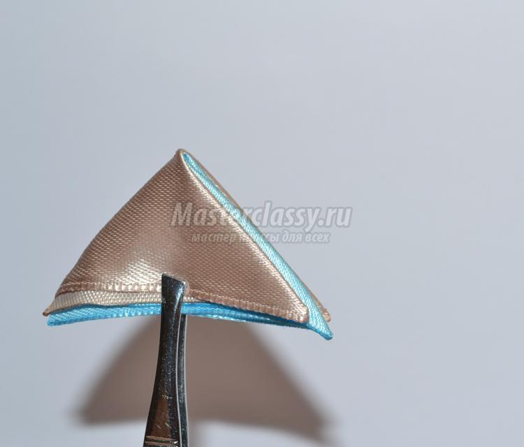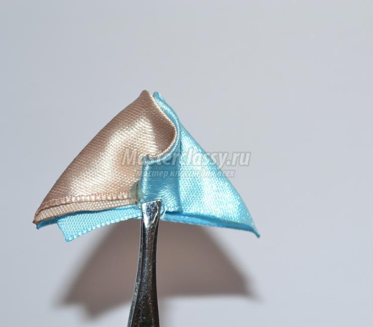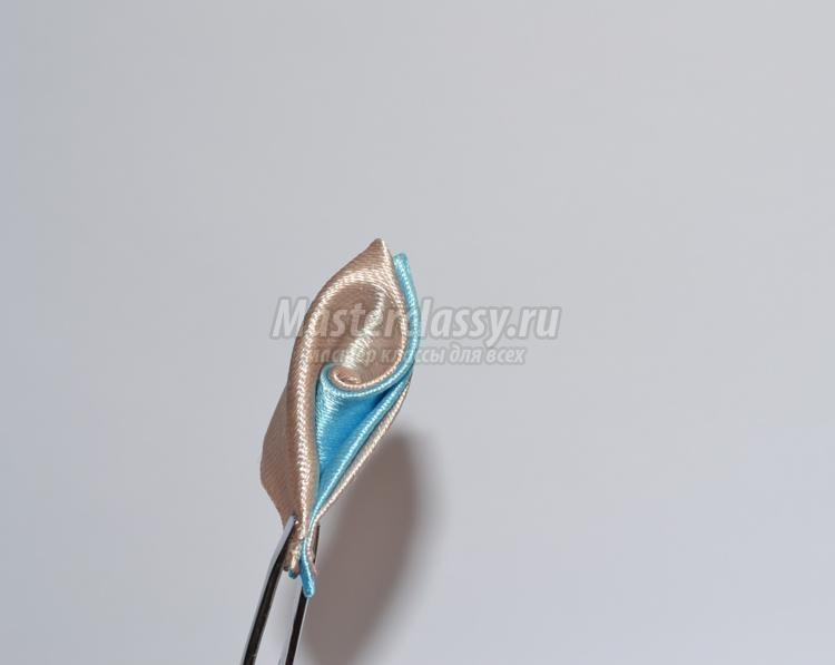 Luego metemos un triangulo resultante de un color dentro del triangulo del otro color. Enrollamos una de las esquinas hasta la mitad y juntamos los extremos del triangulo, formando el pétalo.