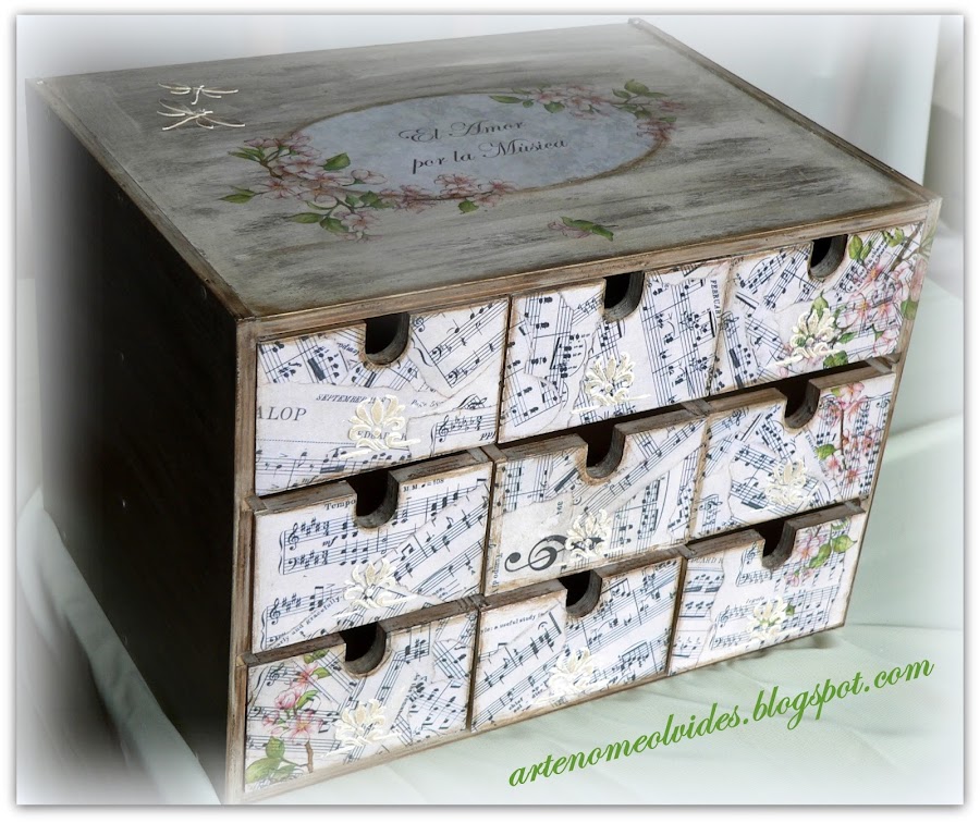 Jaki? czas temu, kole?anka z pracy powiedzia?a mi ?e kupi?a drewnian? szafeczk?, która ma do?? chropowat? powierzchni?. Zaproponowa?am wi?c jej, ?e mog? j? dla niej "naprawi?". Ale jak przej?? oboj?tnie obok drewnianego przedmiotu bez zrobienia na nim decoupage? Jako ?e kole?anka jest muzykiem, na dodatek z Japonii, postanowi?am umie?ci? te tematy na jej szafeczce.