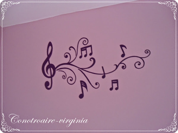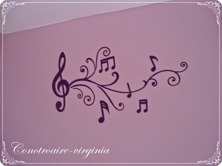 Con vinilo, un cutter y muchiiiiiisima paciencia, le hice el logo de Violetta y las notas musicales para decorar la pared.