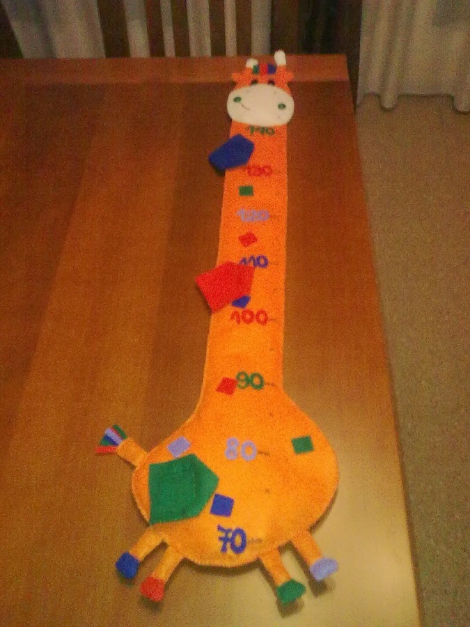 -jirafa medidora, para ir poniendo la foto de los niños a la altura que corresponda conforme vayan creciendo. Está realizada en fieltro.