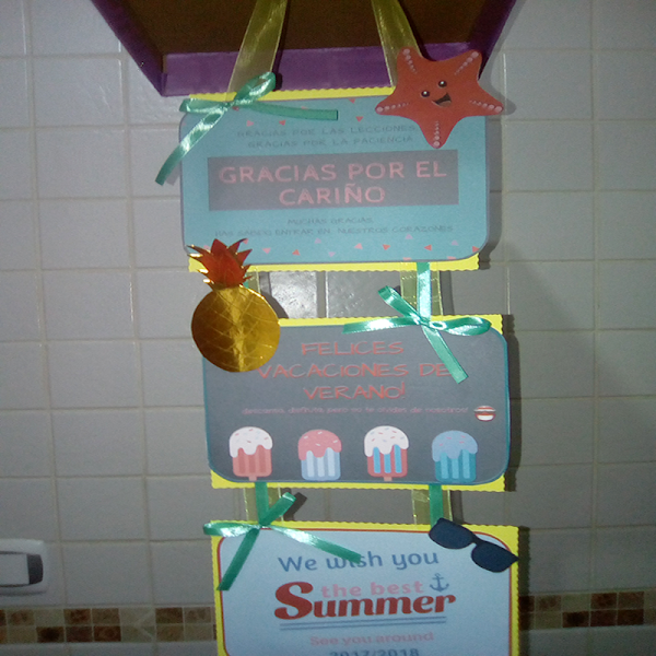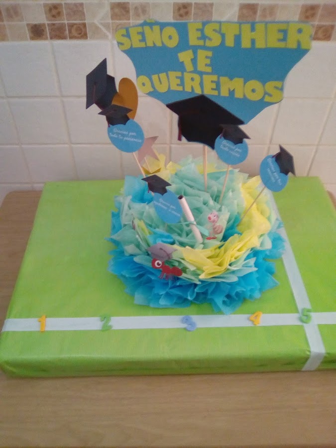Uno de los regalitos para Rocío, un encanto de mujer, con el que los niños de 1º de Primaria A, han podido compartir éste primer año en la escuela de mayores, es una lástima que sólo haya sido un año, pues era interina y nos enteramos el mismo día de la fiesta de fin de curso, que le han asignado otro cole, teníamos la ilusión de que continuara con los niños, porque además de ser una excelente profesional, es dulce y cariñosa con los peques. Le echaremos de menos y los peque aún más, deseamos de corazón que le vaya muy bién en el nuevo cole, suerte tienen los niños a los que les toque de seño, se llevarán a una de las mejores.