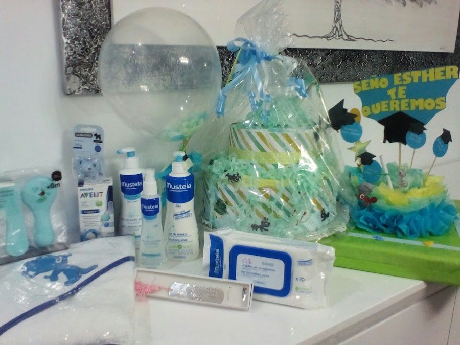 Y para Esther, elegimos un marca páginas de plata, grabado con el nombre de todos los peques, el nombre de la clase y el periodo escolar., además ya que Ester espera a su primer bebé y los peques han vivido todo ese proceso, han ayudado con mucha ilusión en la elección del nombre del bebé y han estado en todo momento al tanto y pendientes de esa tripita, acompañamos el detalle con una tarta de pañales, un pequeño lote de artículos para el cuidado del bebé, un globo transparente que sirvió de relleno para la enorme caja y un ramo de rosas.
