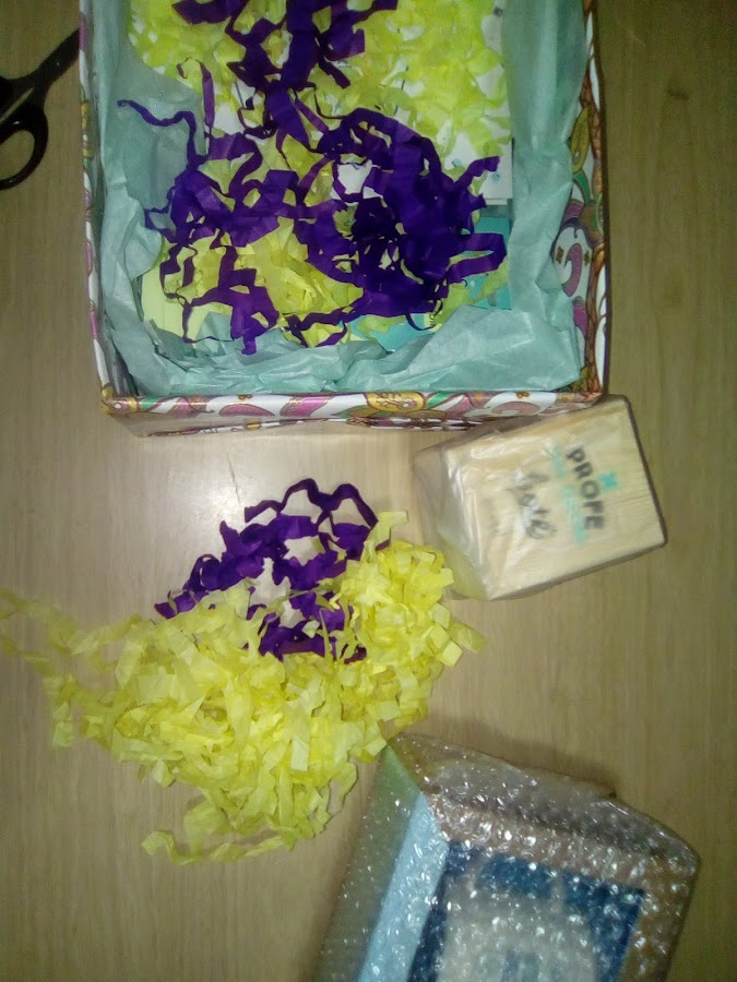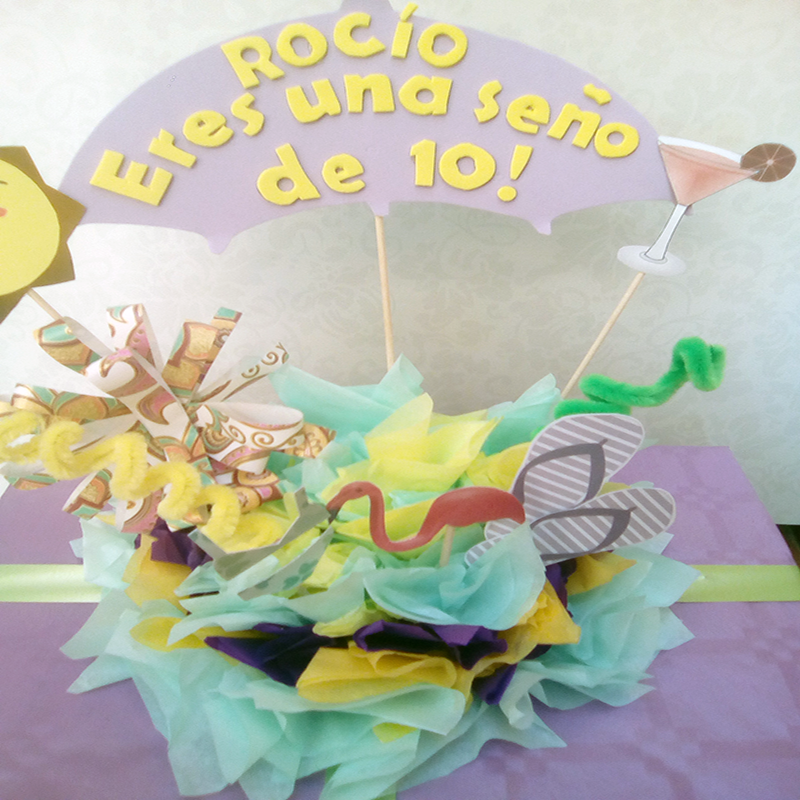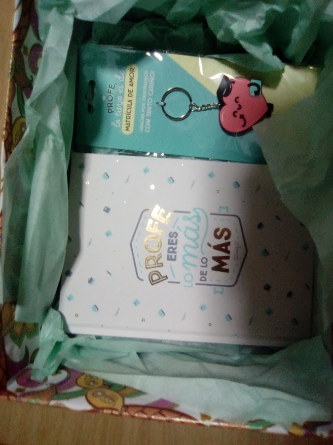 Os muestro con detalle lo que decidimos preparar para cada una de las seños, en el caso de Rocío este año optamos por los originales artículos de Mr Wonderful, una taza, una agenda, un portalápices y un gracioso llavero, todo acompañado de un bonito ramo de flores, llevado a modo de sorpresa el último día de cole por un mensajero, a mi me tocó encargarme del embalaje y éste fué el resultado.