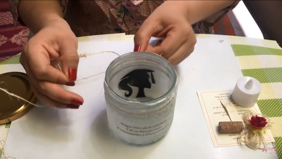 Dejamos secar y empezamos con la decoración, por el borde del frasquito enredamos el hilo de fique, hacemos dos vueltas anudamos y cortamos los excesos.