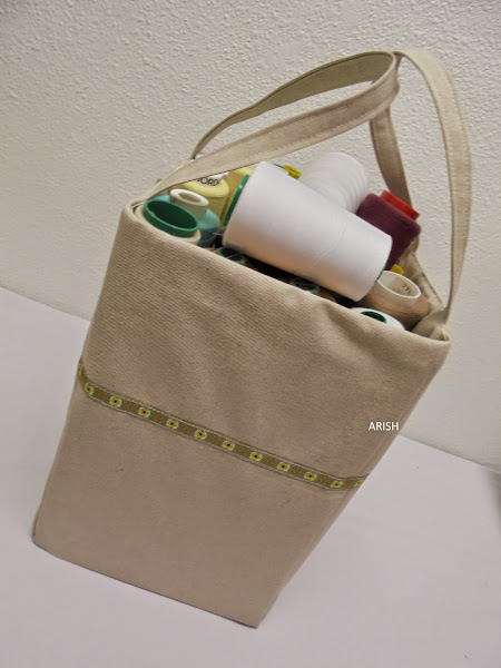 la he forrado, bueno más bien enfundado por fuera y por dentro con un lino tostado y le he puesto una cinta de adorno que me sobró del vestido de lino encerado que me hice en la primavera del año pasado, también le he puesto unas asas para manejarla más cómodamente;